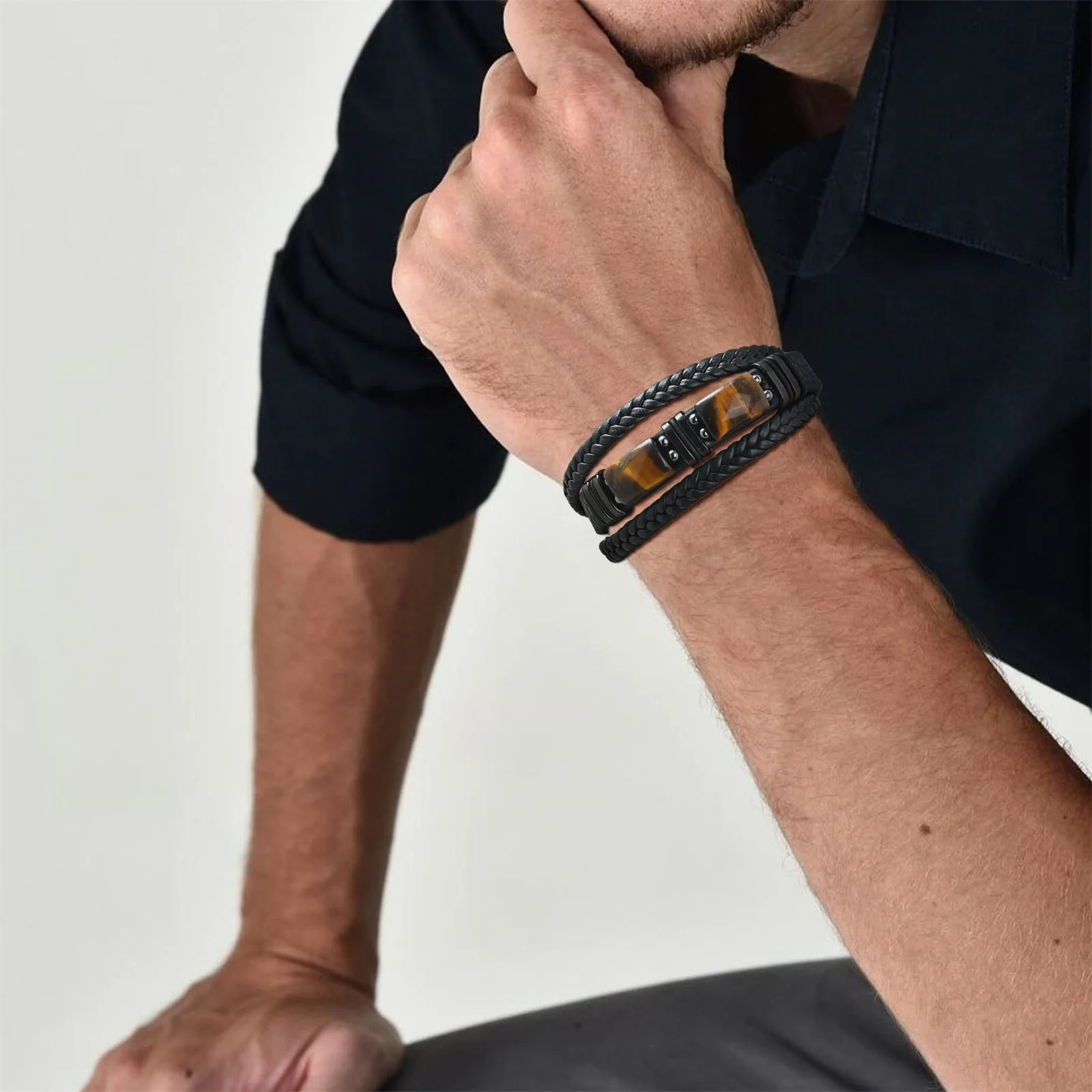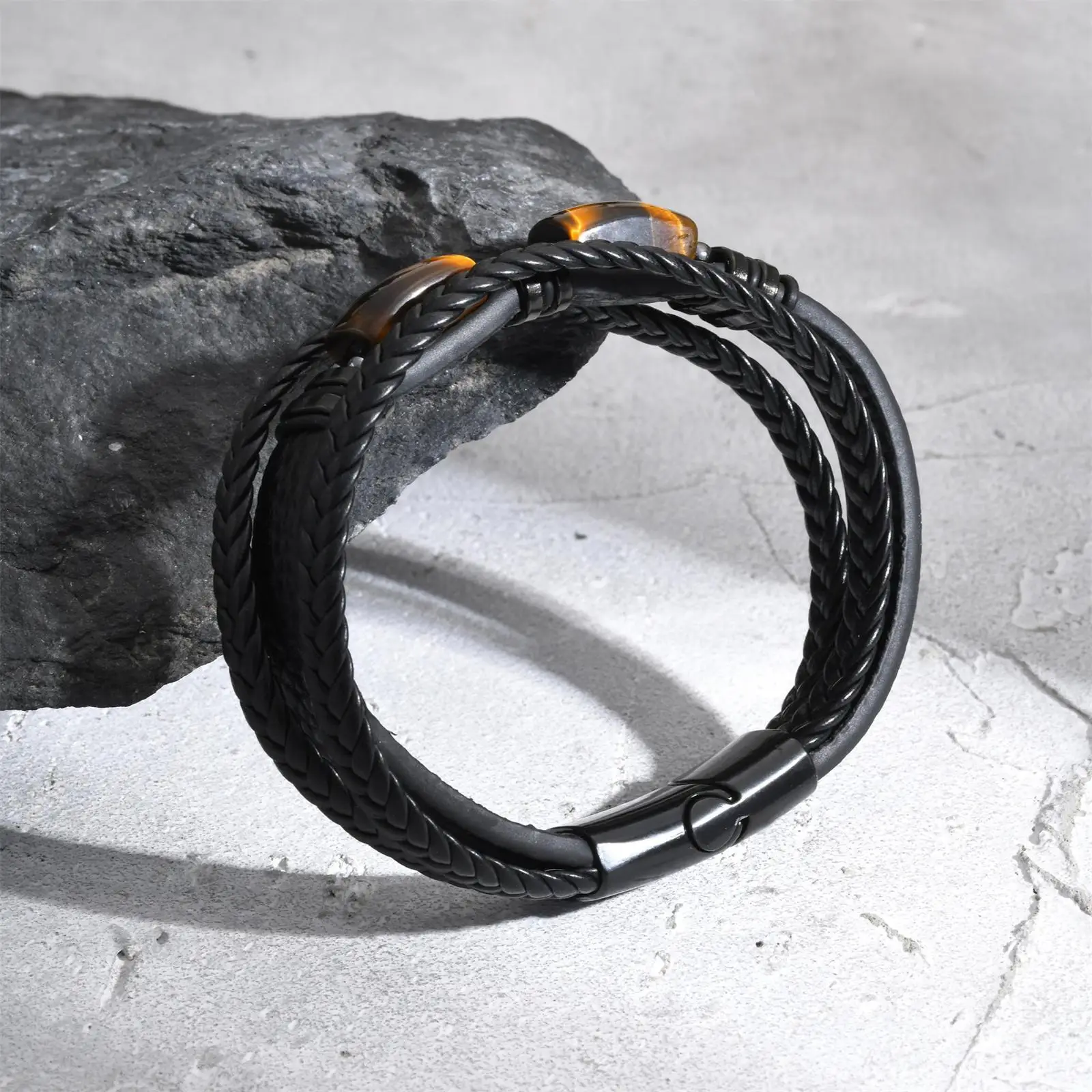 Chunky Leather Bracelet for Men Boys,Two Big Tiger Eye Natural Brown Stone Bracelets,Rock Punk Causal Jewelry Gifts