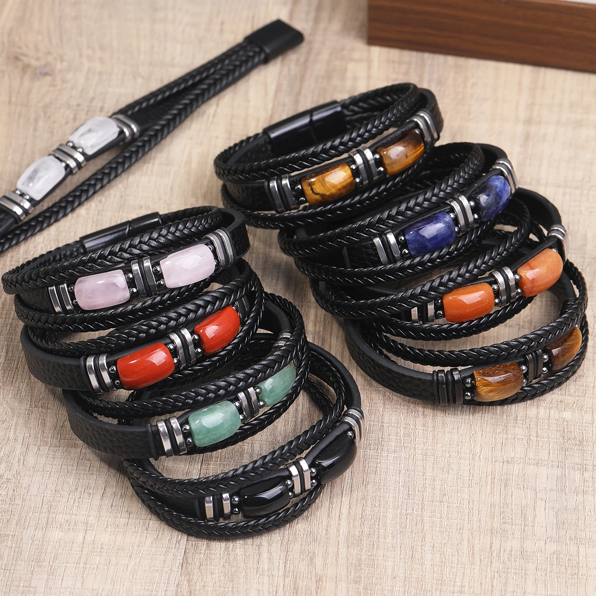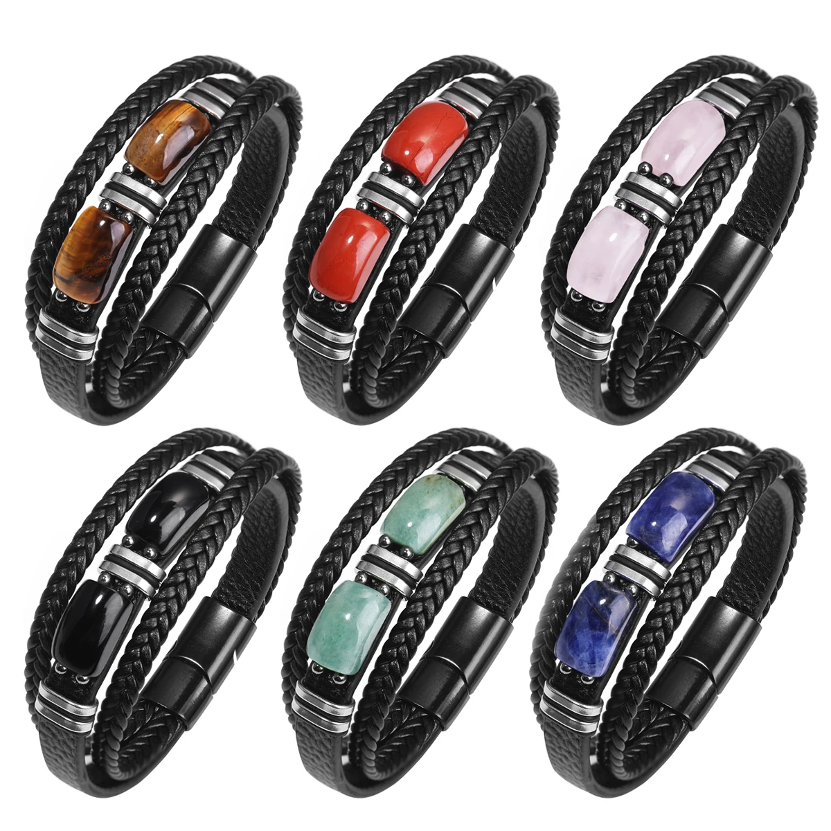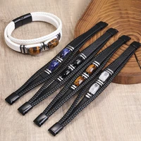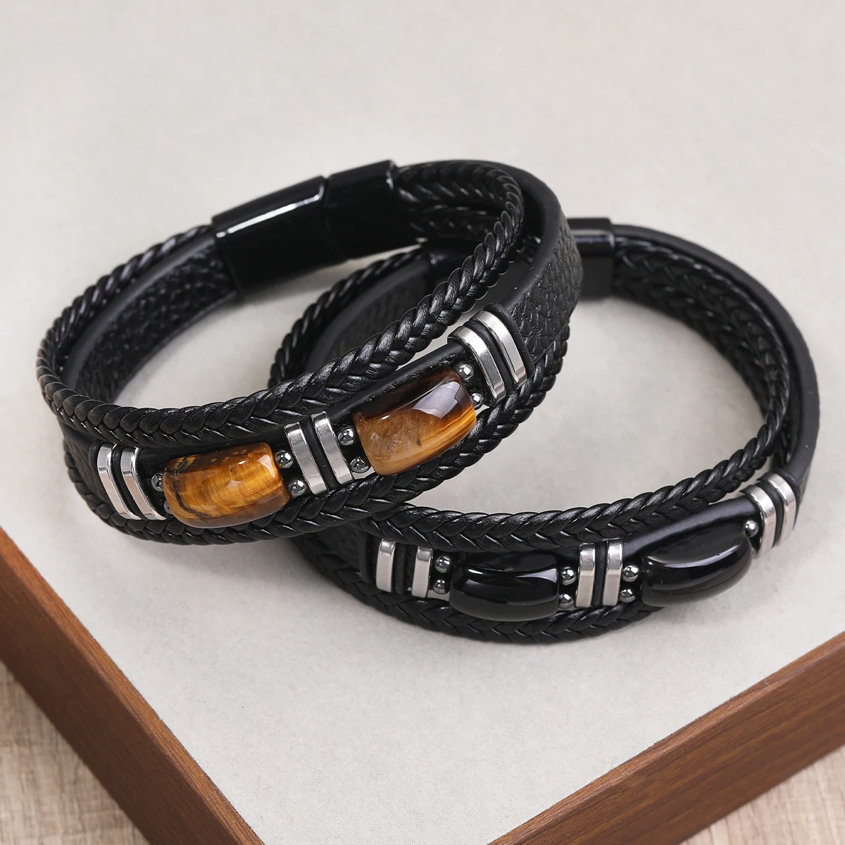 Classic Charm Man Bracelet Natural Stone Tiger Eye Stone Obsidian Bracelet Magnet Buckle Leather Bracelet