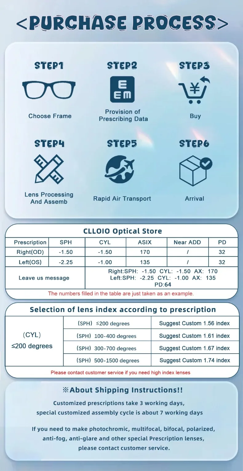 If you need other refractive index lenses, please order according to Method 2 or contact customer service