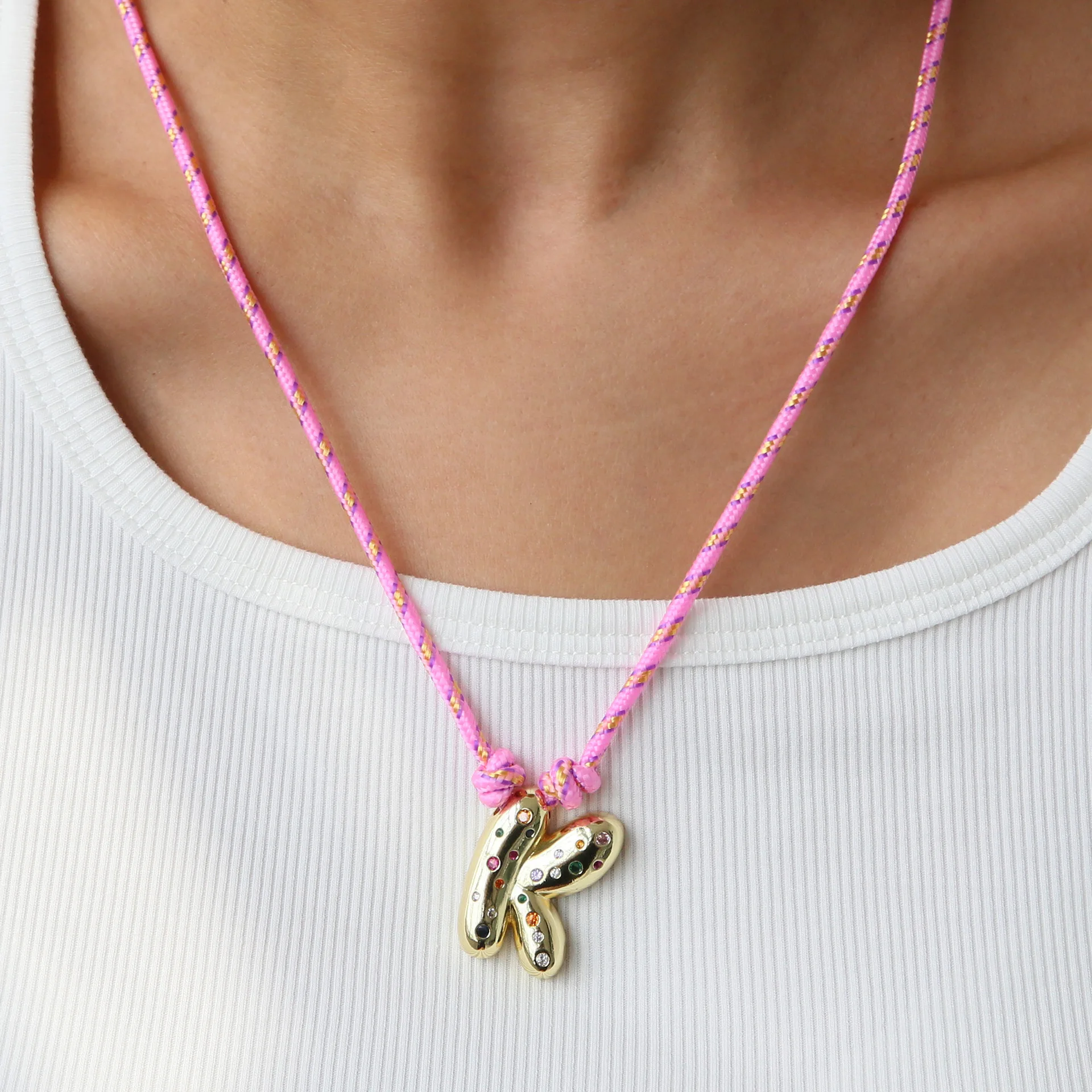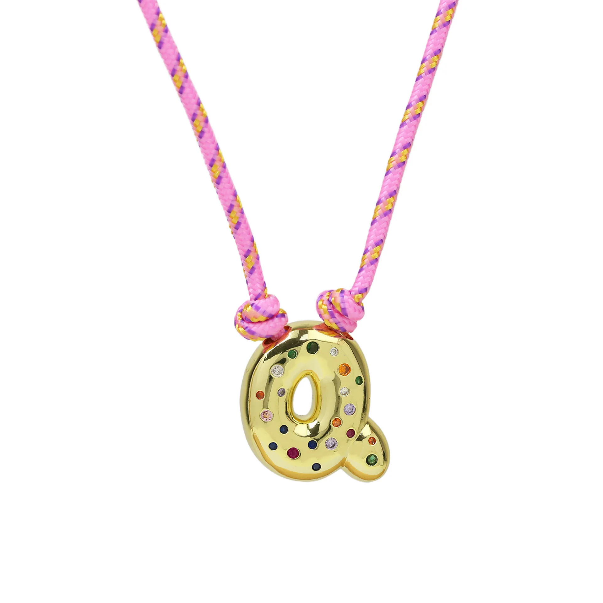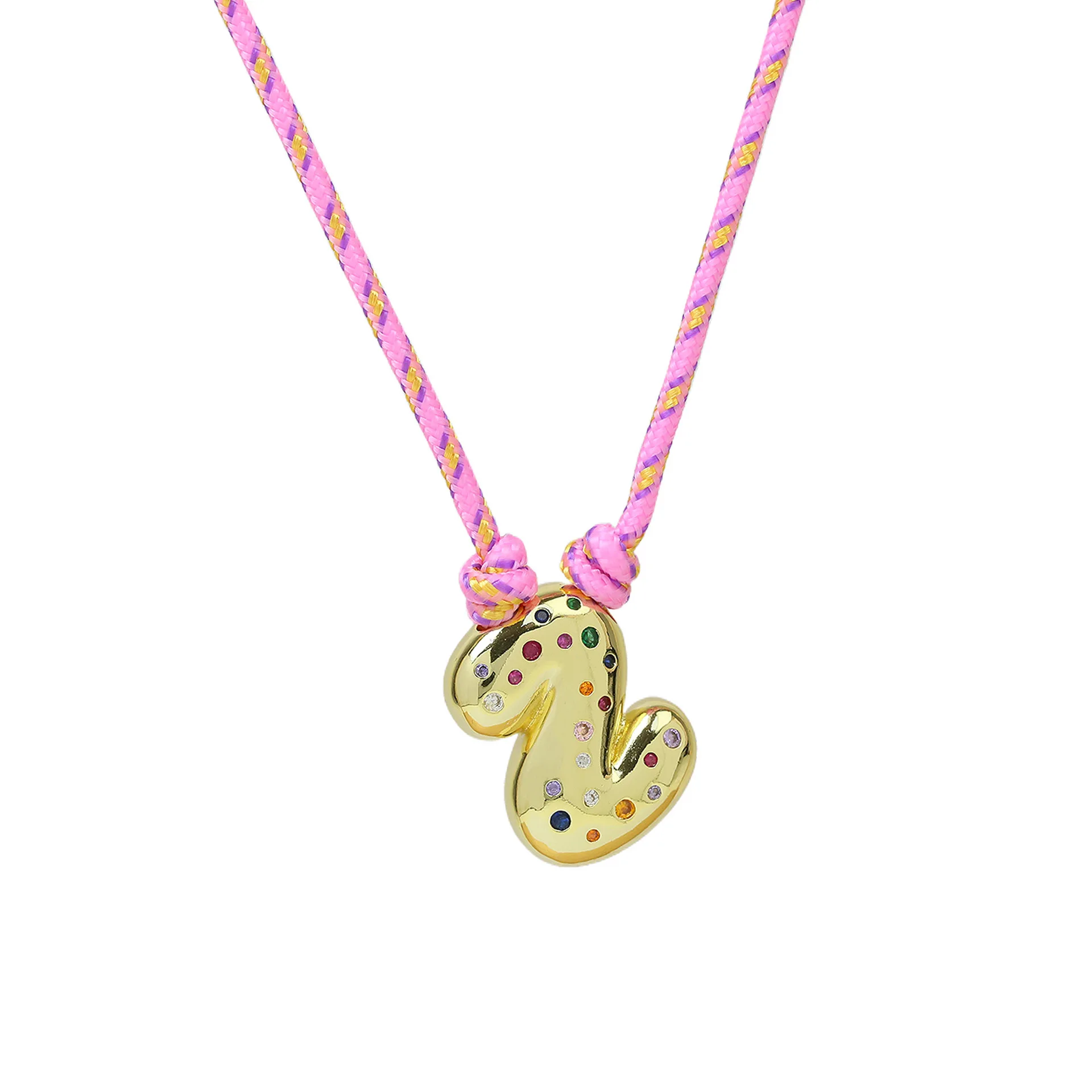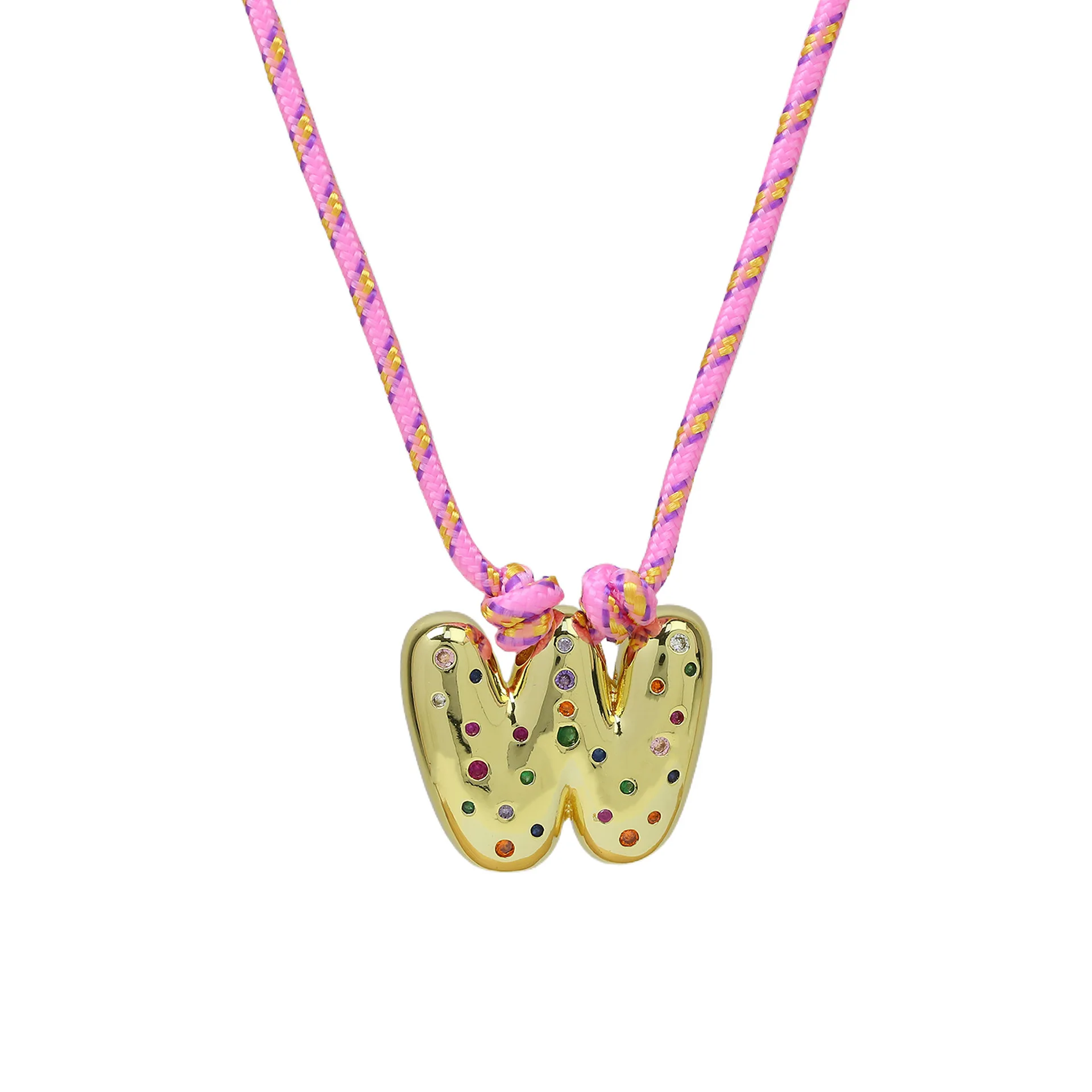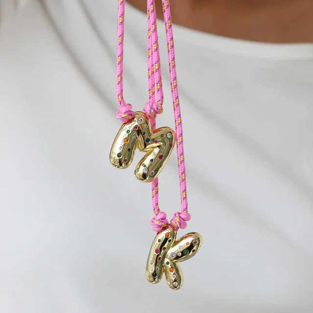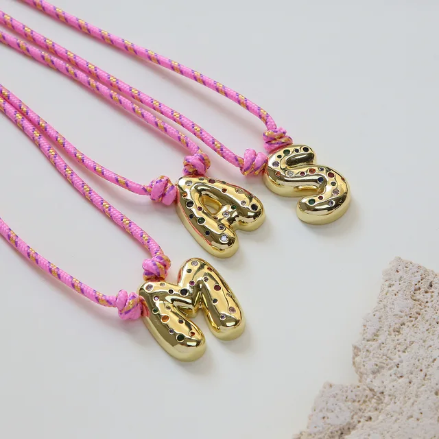 Colorful Cubic Zirconia Chunky Bubble Letter Pendant Necklace for Women Fashion Pink Rope Chain 18K Gold