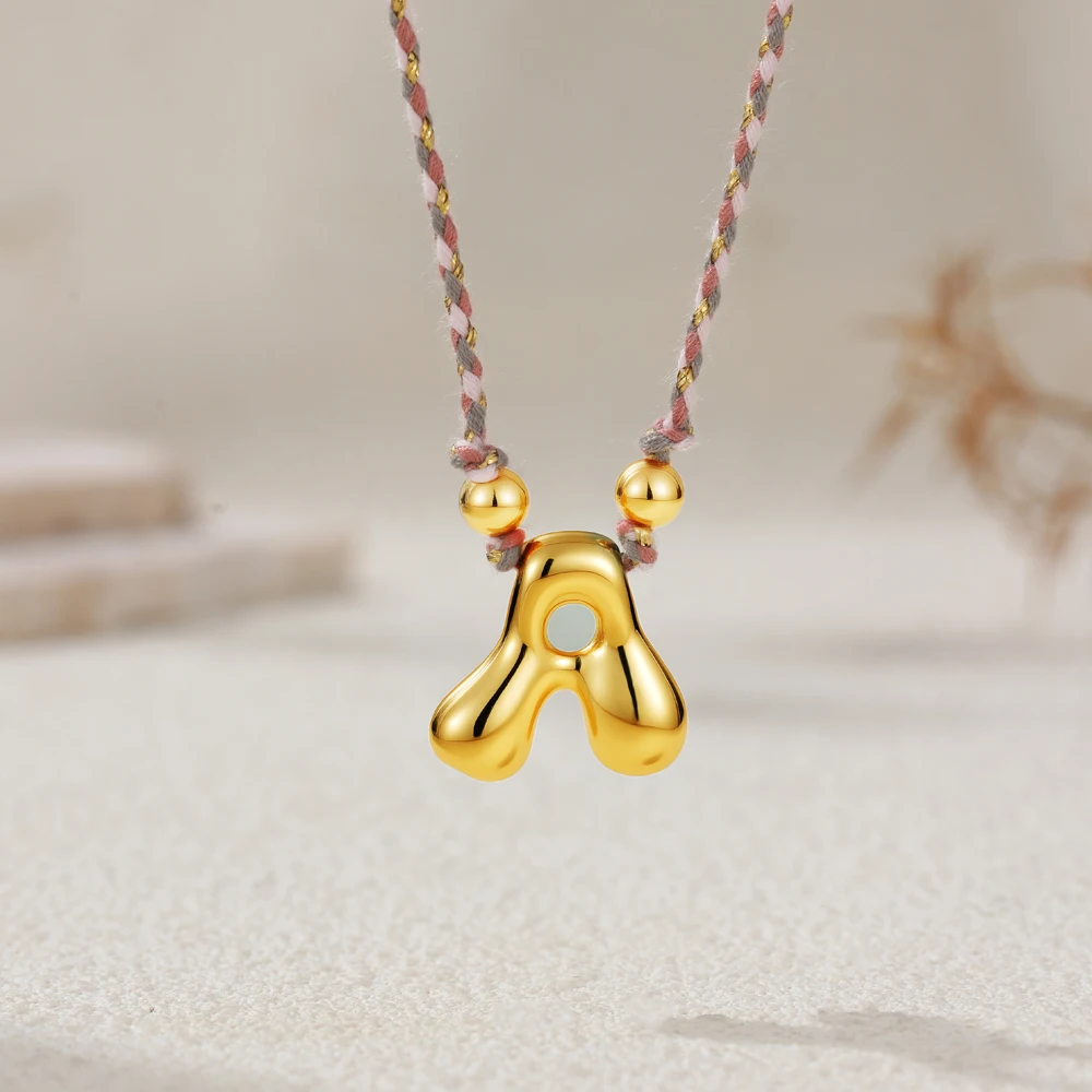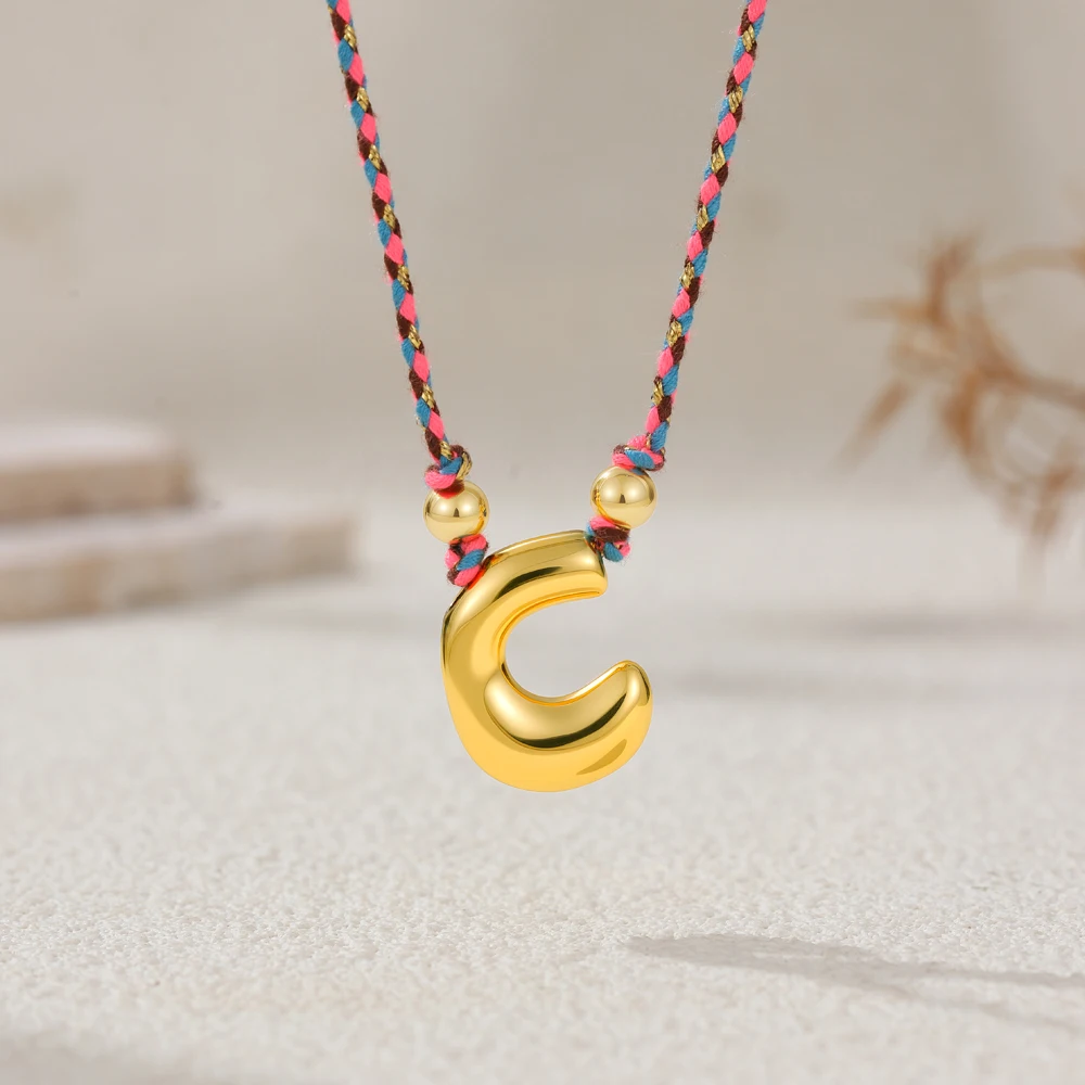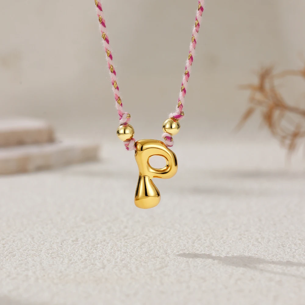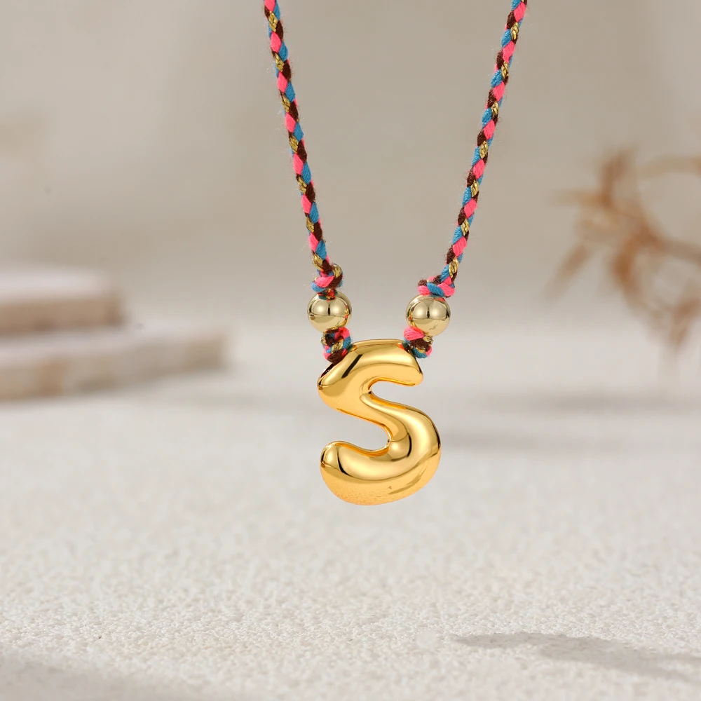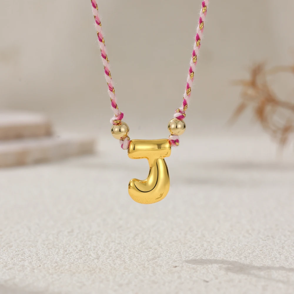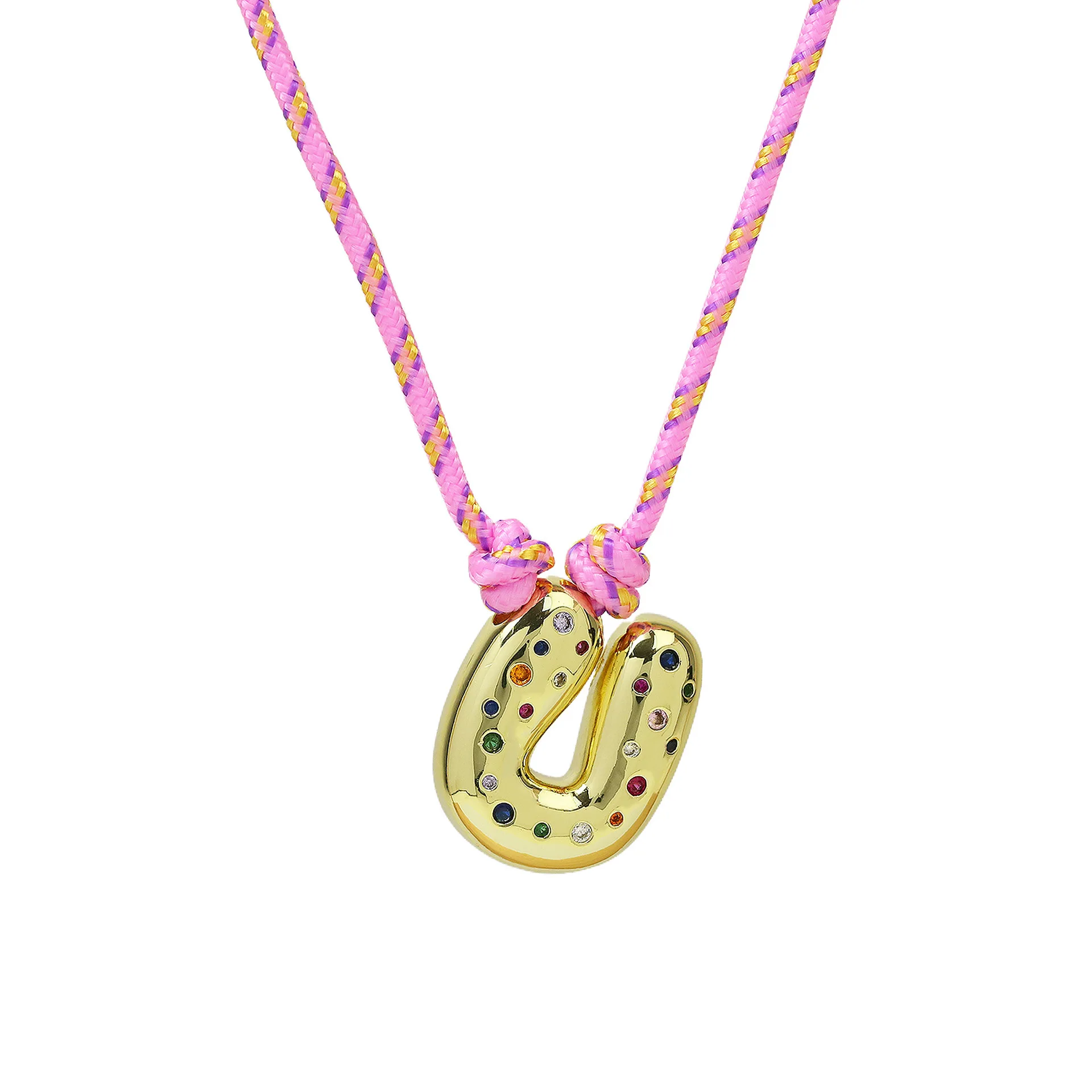 Colorful Cubic Zirconia Chunky Bubble Letter Pendant Necklace for Women Fashion Pink Rope Chain 18K Gold