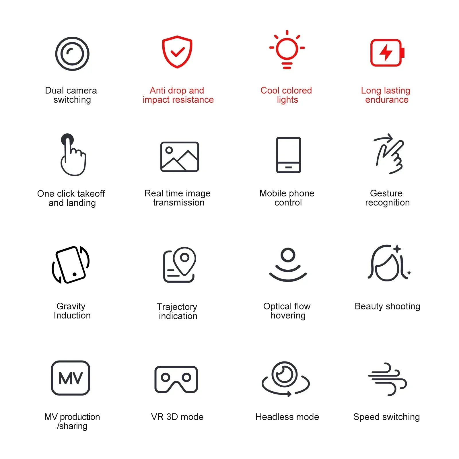 Up/down, Forward/backward, Turn left/right, Sideward flight, 3-level flight speed, LED Light, Headless Mode, One Key Automatic Return, Altitude Hold Mode, WiFi FPV, Trajectory Flight, Camera/Video