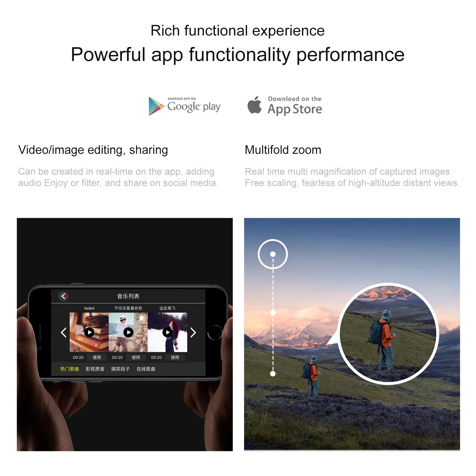 – There have 2 cameras can be choose. With 1080P or 4K wide angle camera give wide high denfinition pictures and video.