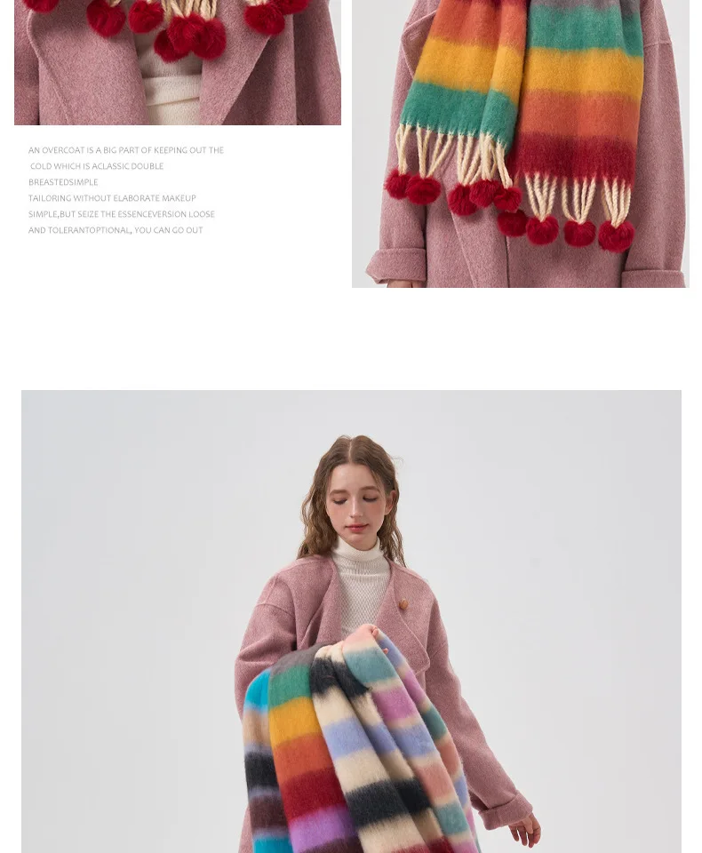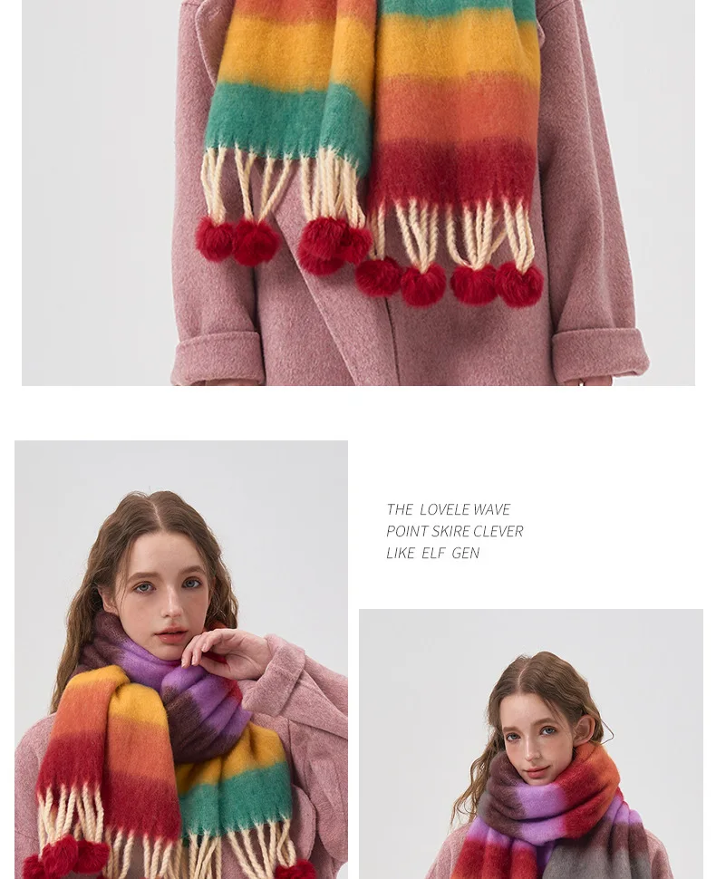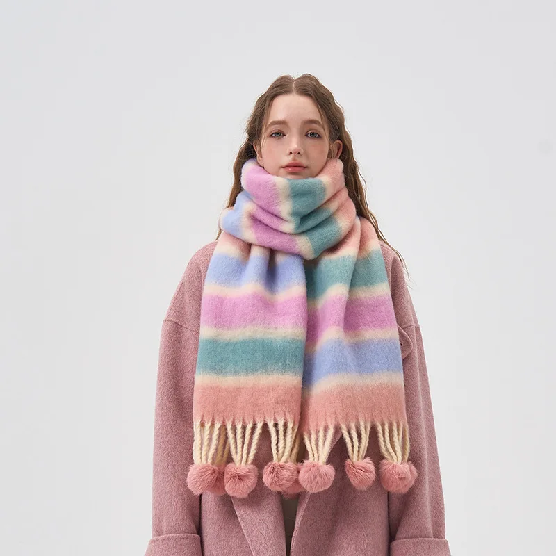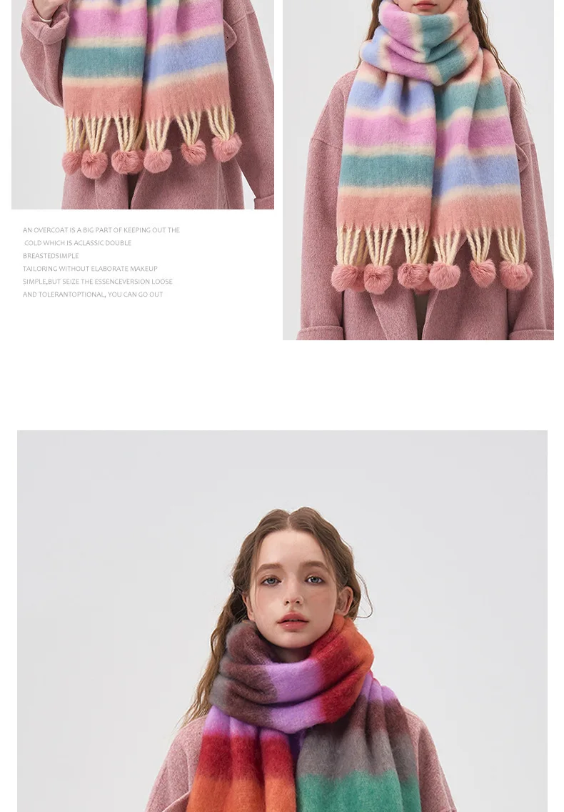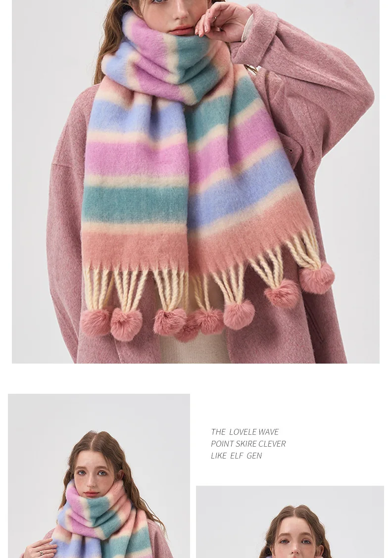 Colorful Striped Winter Scarf for Women Hairball Pashmina Scarves Wraps Female Thick Soft Bufanda Big