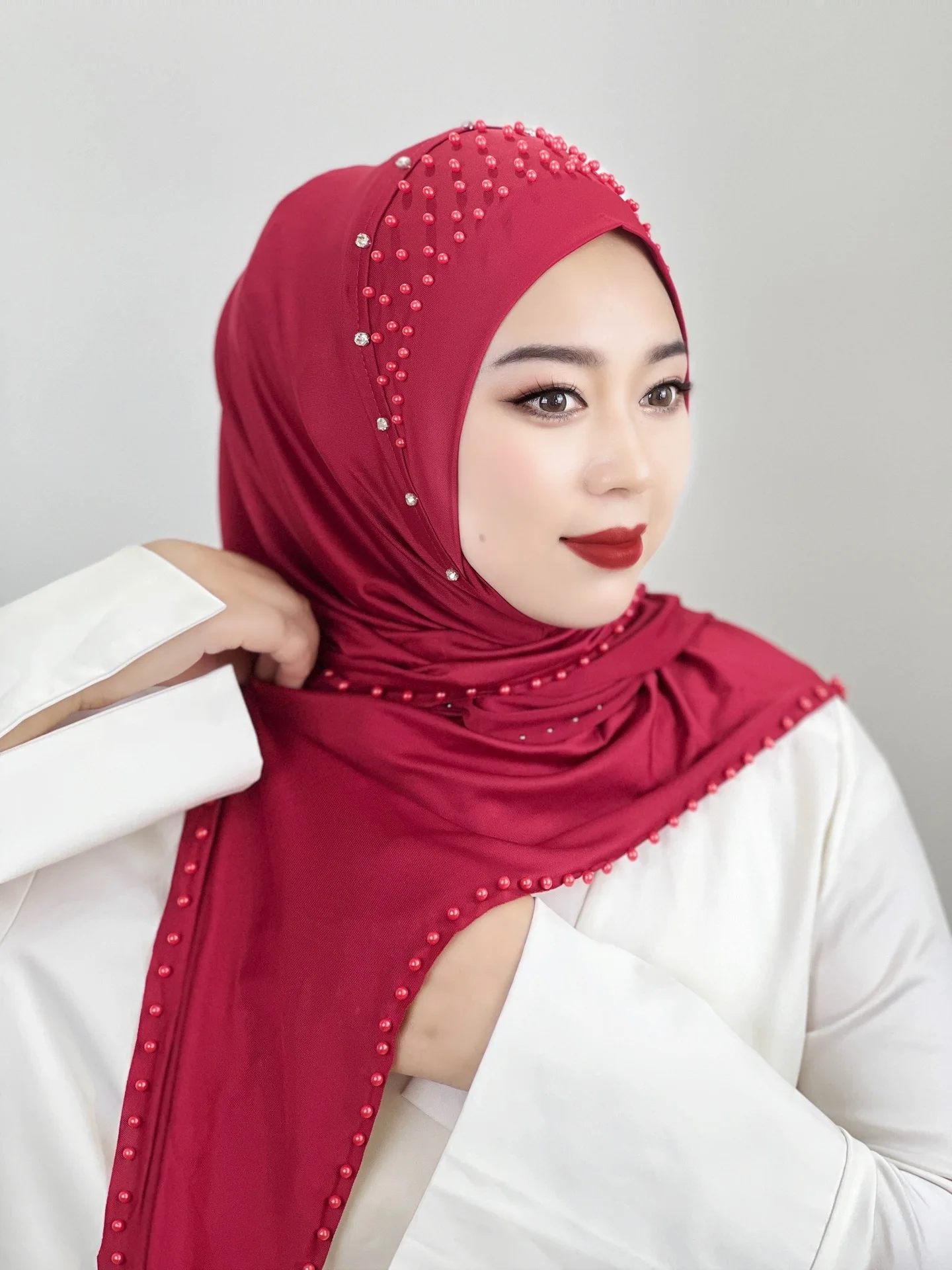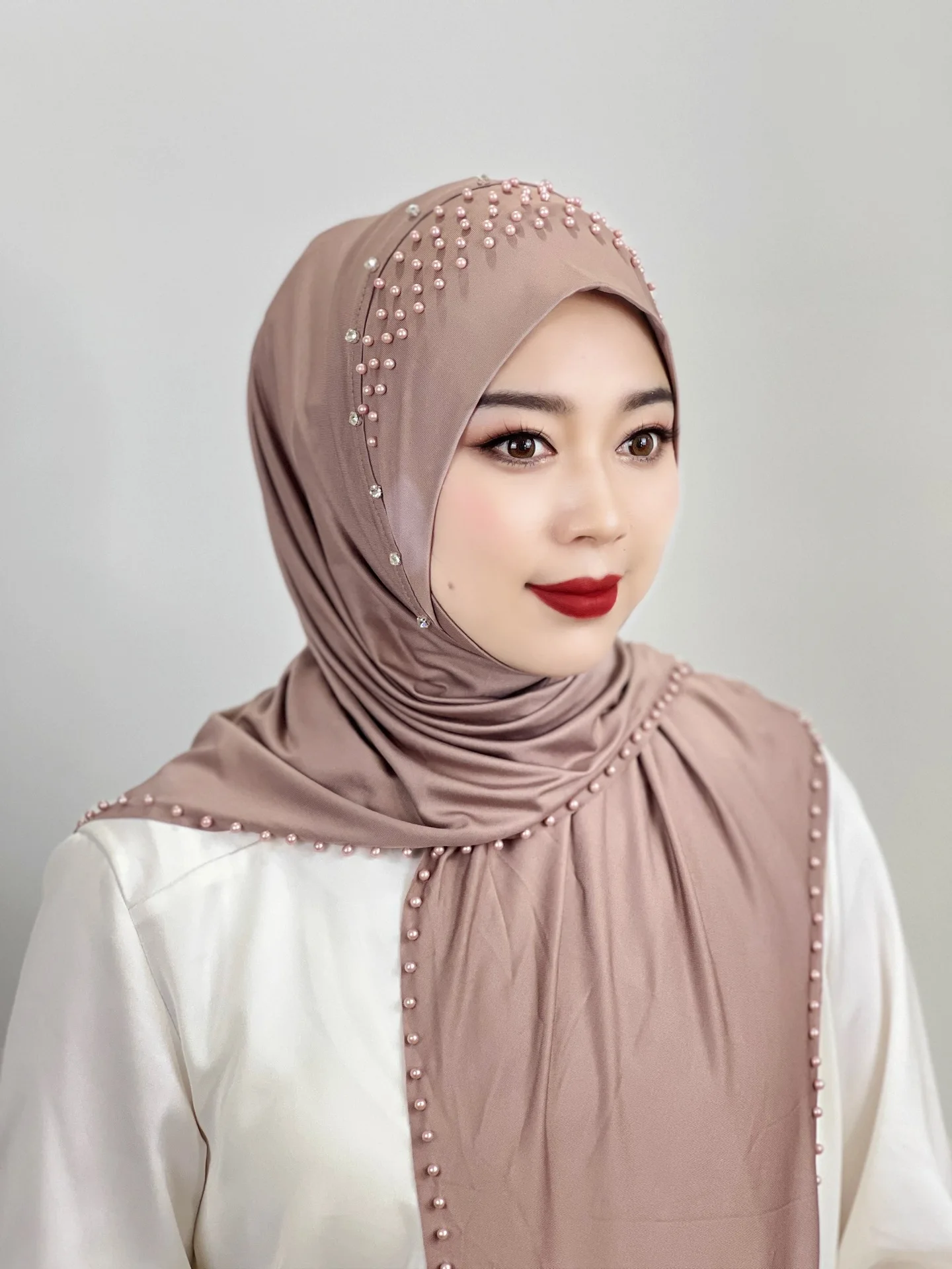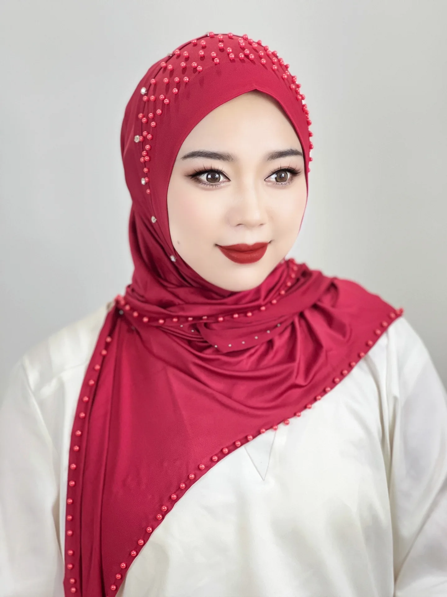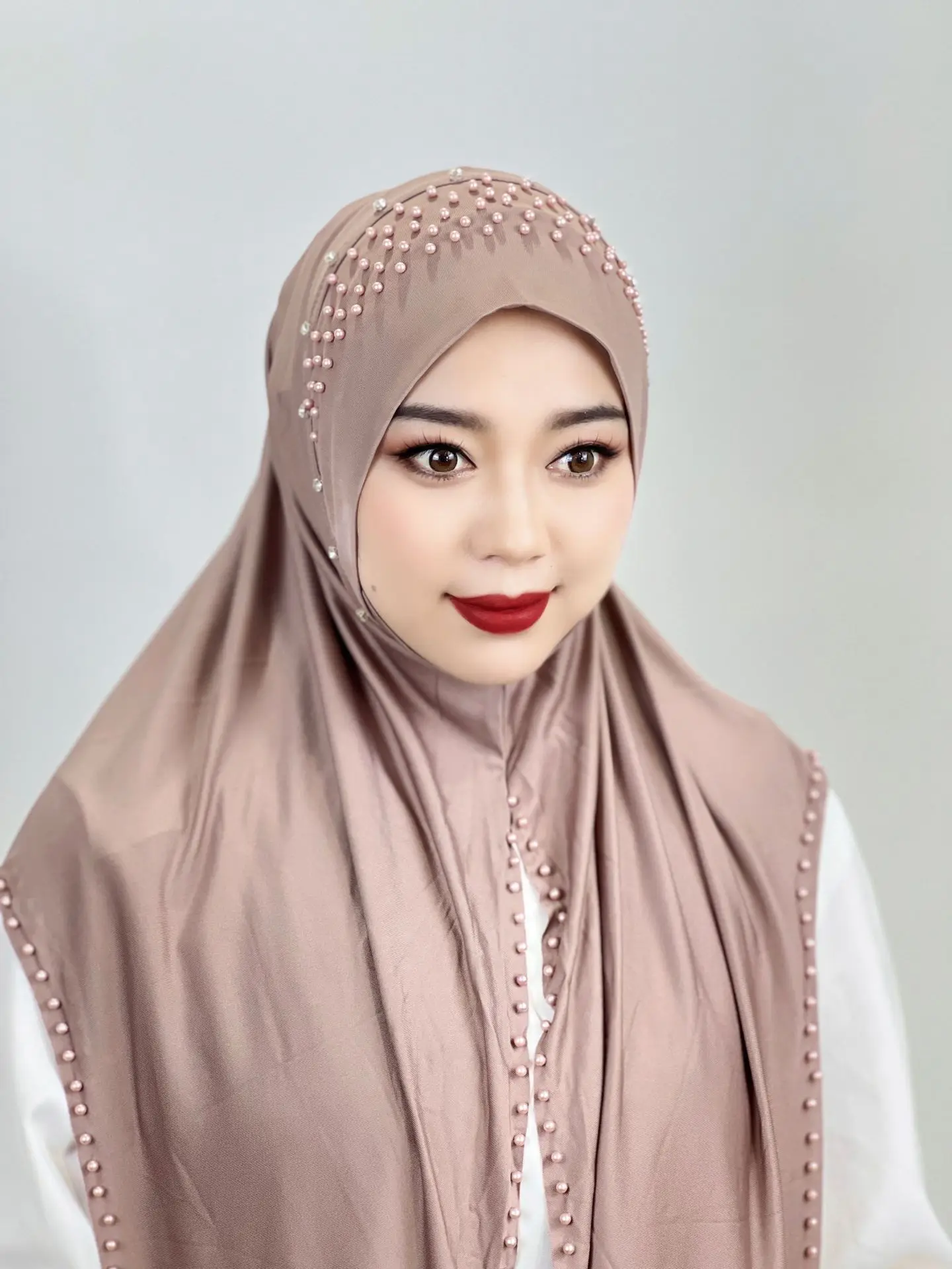 Convenient Instant Hijab Pullover Beaded Scarf Malay Shawl Women’s Solid Color Headscarf (one cap gift)