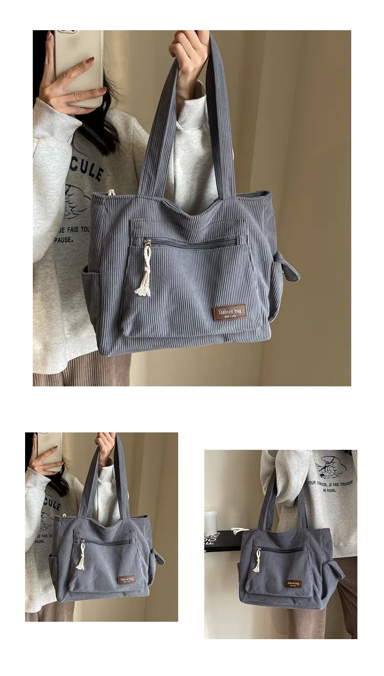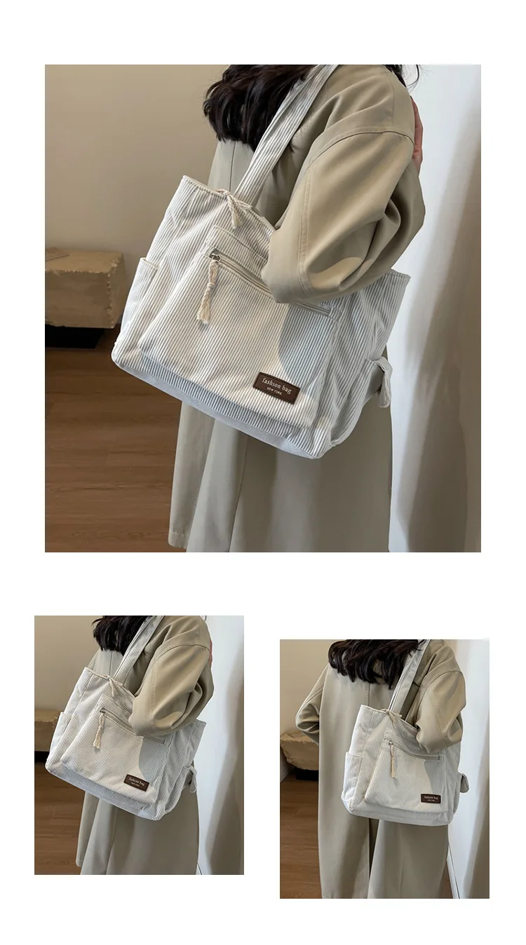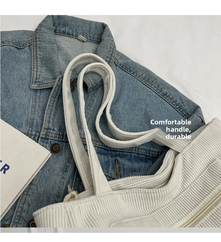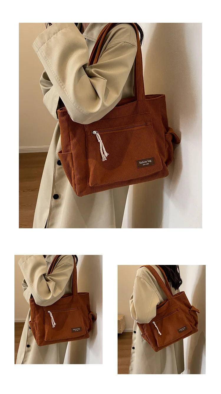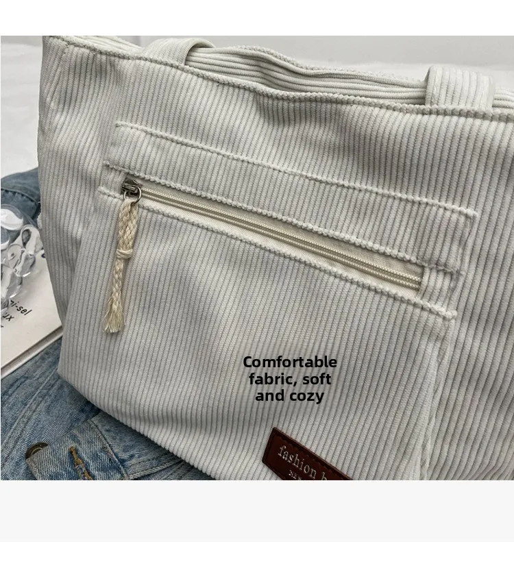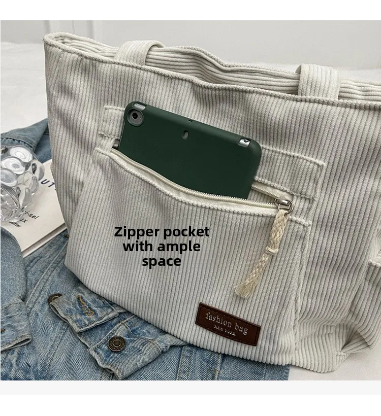 Crafted from high-quality corduroy, this tote bag offers durability and a touch of elegance.