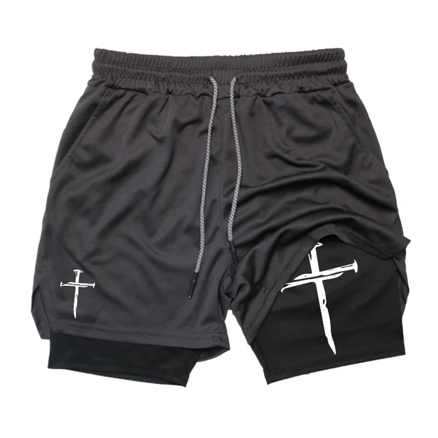 Cross Graphic 2 in 1 Workout Running Shorts for Men Christian Gym Performance Shorts with Phone Pocket