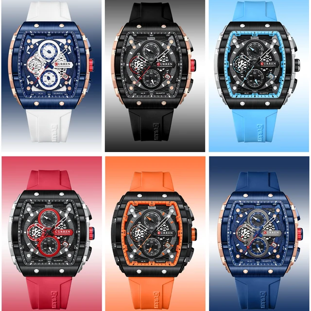 atuo dat, chronograph(1/10 seconds dial, seconds dial, minute dial), silicone strap, square large dial,waterproof 3 ATM