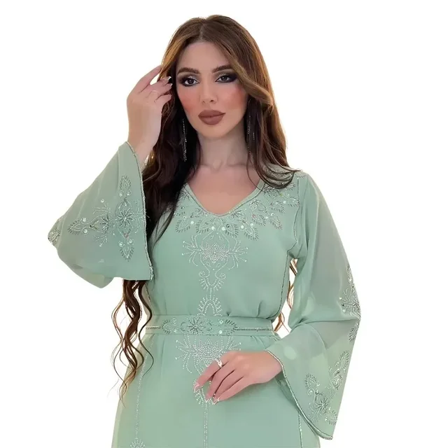 Polyester Muslim Abaya for Women Summer Elegant Orange Blue Pink Green Muslim Women Long Sleeve V-neck Polyester Long Abaya