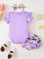 Cute Baby Casual Floral Butterfly Headband Short-Sleeve Romper and Shorts 3-Piece Set