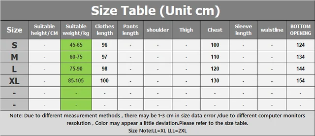 | Size | Suitable height/CM | Suitable weight/kg | Clothes length | Pants length | shoulder | Thigh | Chest | Sleeve length | waistline | BOTTOM OPENING |