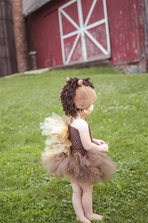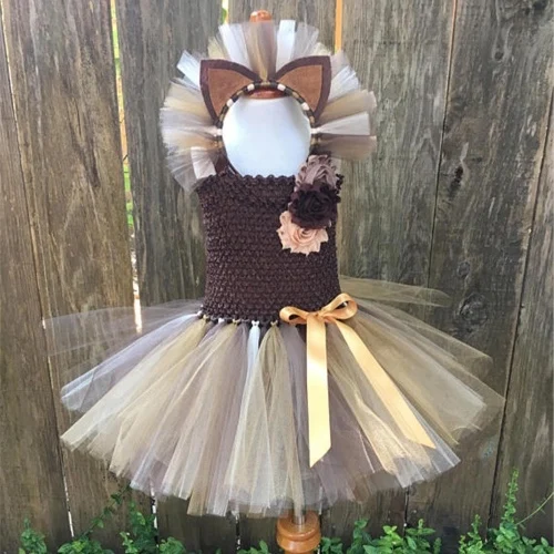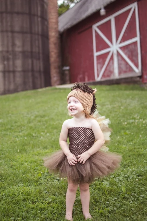 Cute Girls Lion Cartoon Tutu Dress Kids Crochet Tulle Straps Dress with Flowers and Hairbow Children Party Costume Cosplay Dress