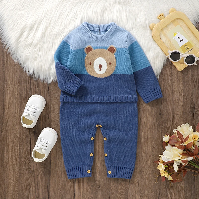 Cute Teddy Bear Long Sleeve O-neck Knitted Acrylic Newborn Infant Boys & Girls Winter Rompers Blue