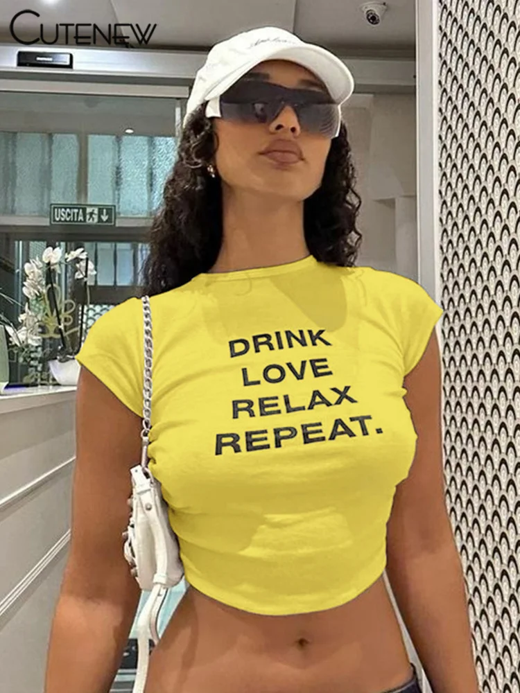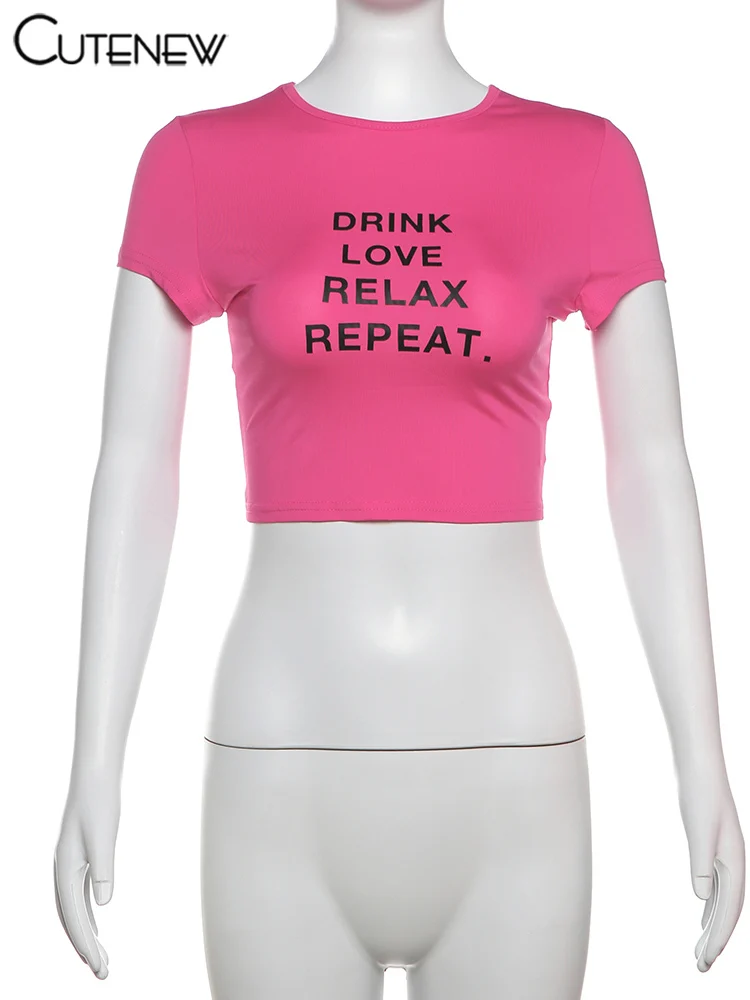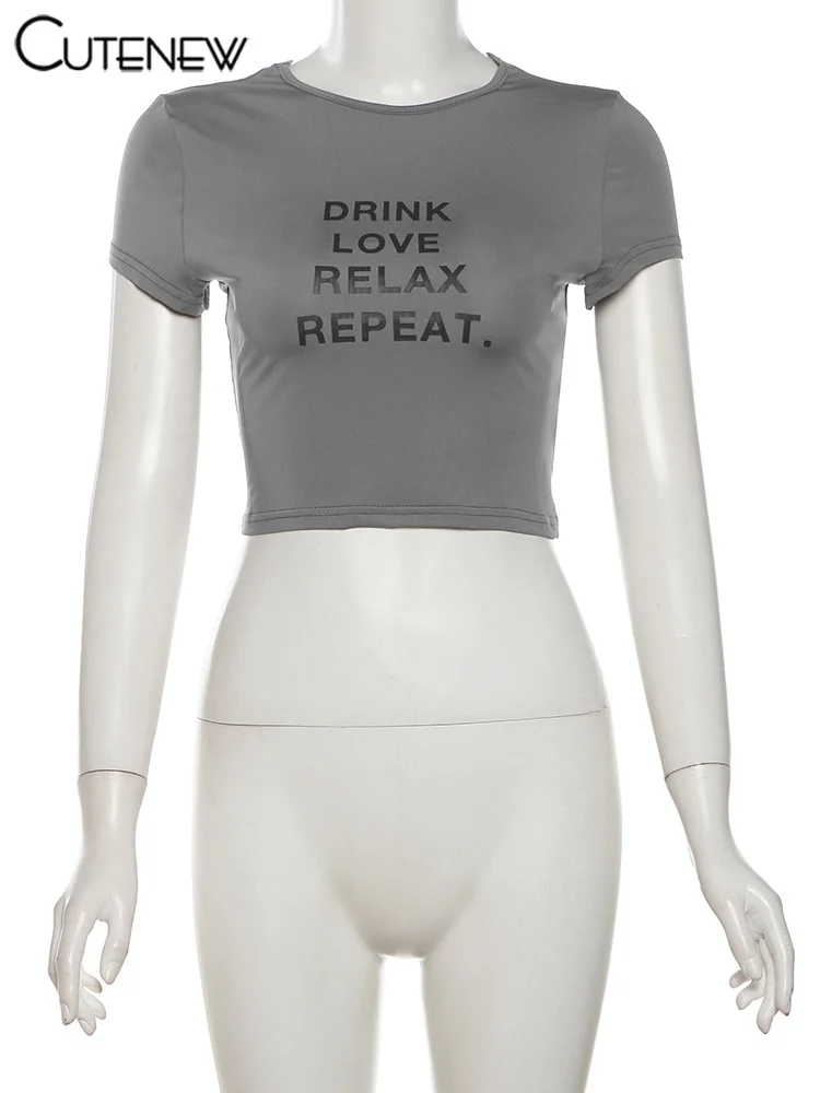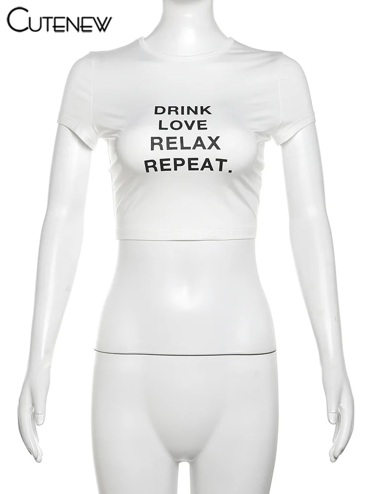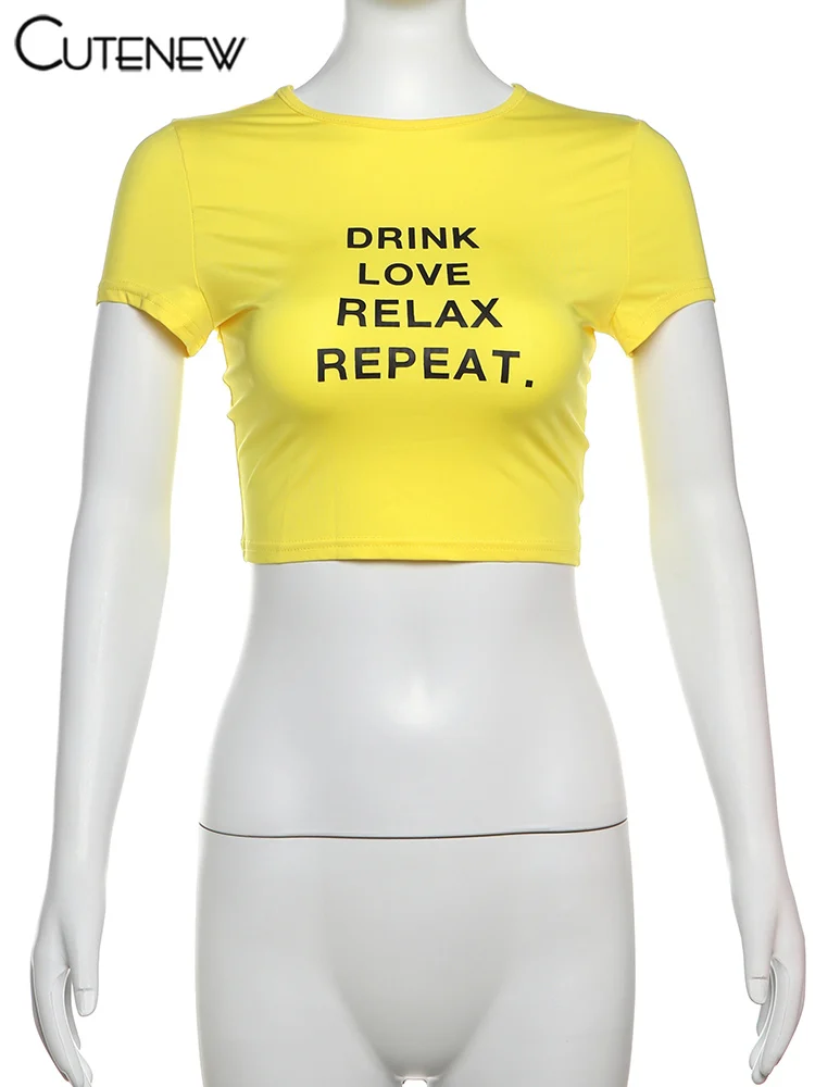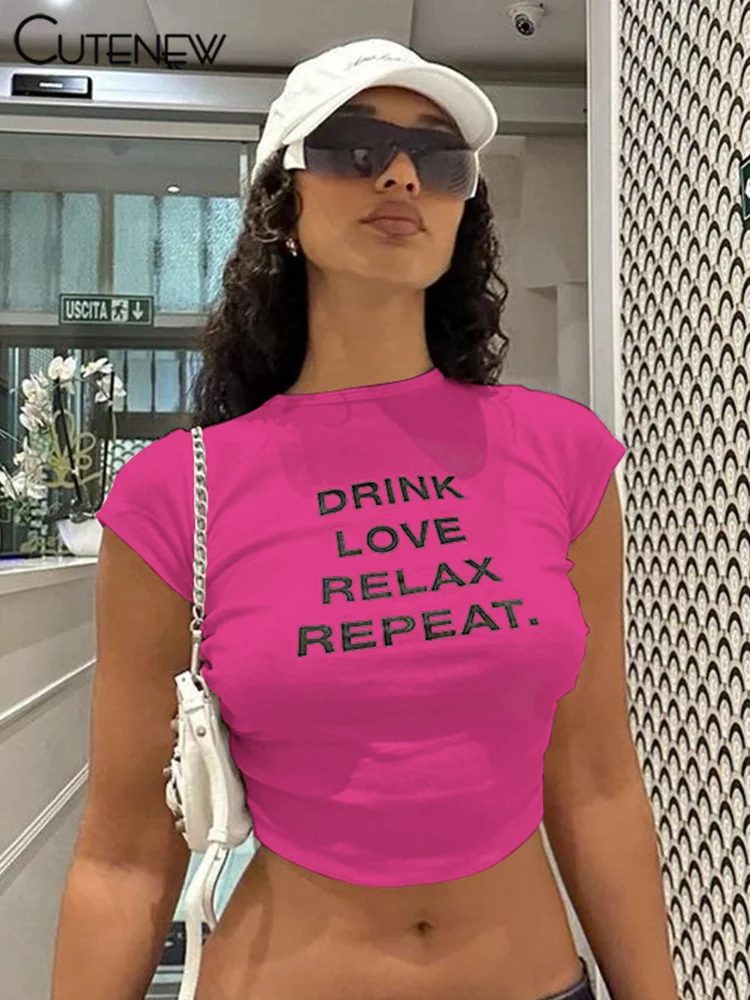 Cutenew Letter Print T-shirts Women Casual Wild Summer New Short Sleeve Shirring Slim Crop Tees Female Classic Basic Streetwear