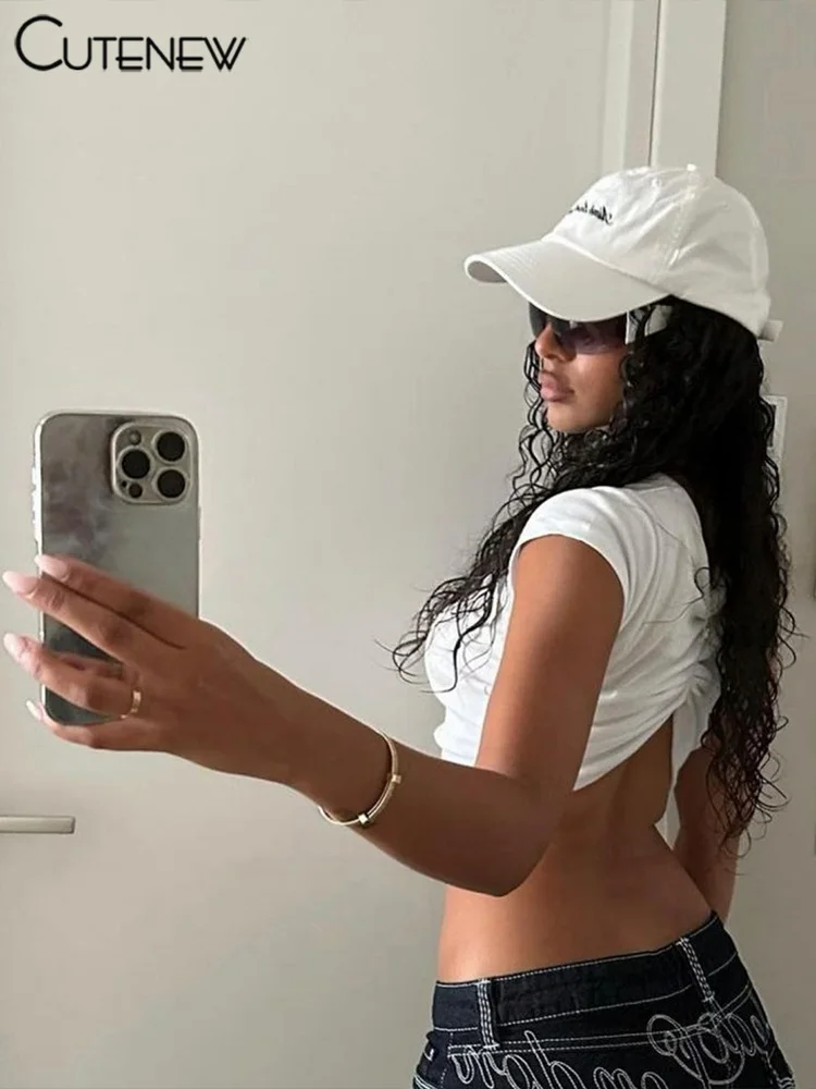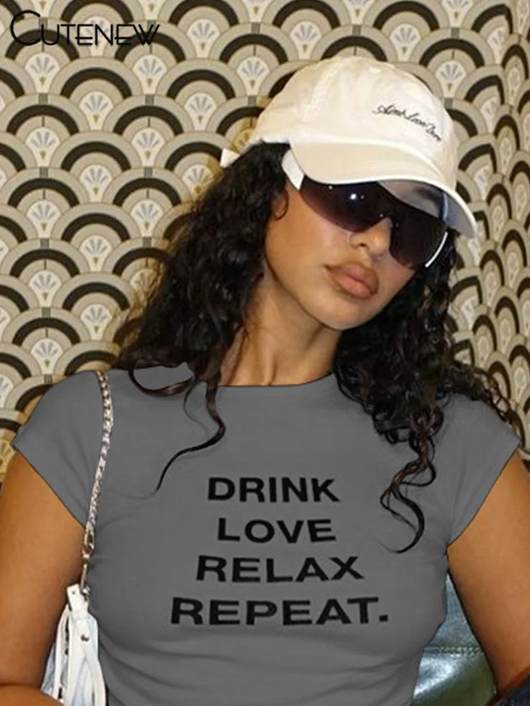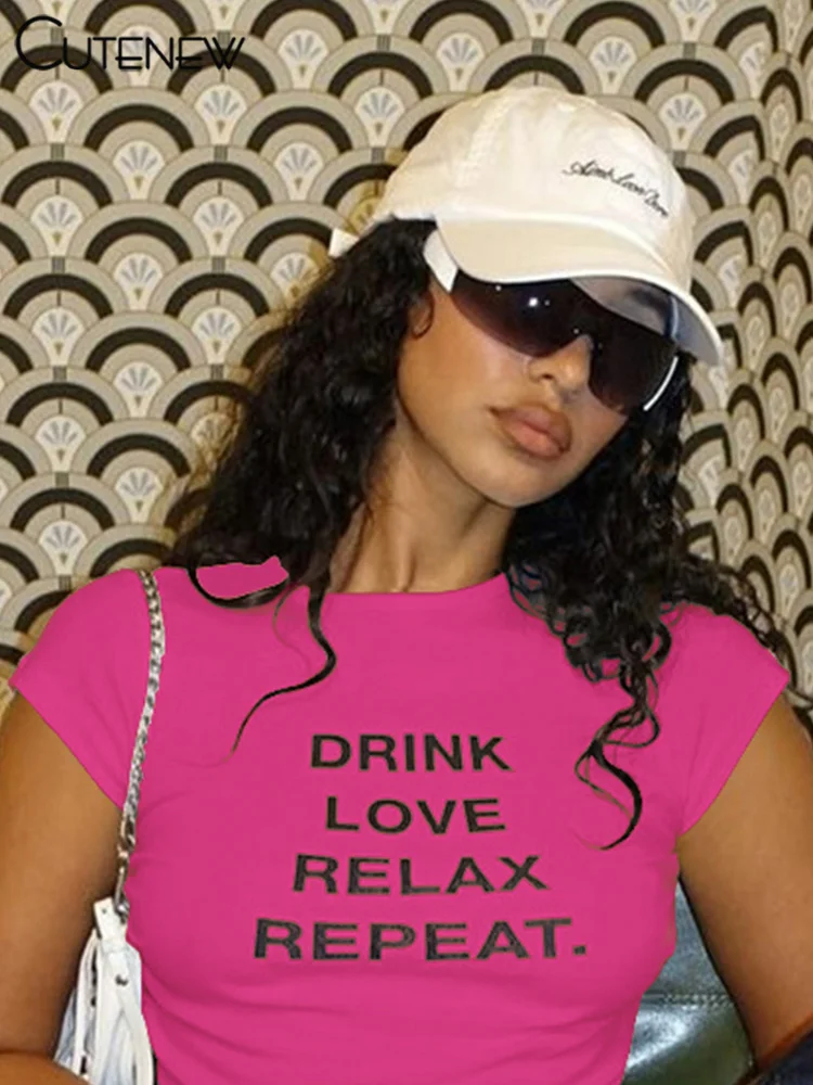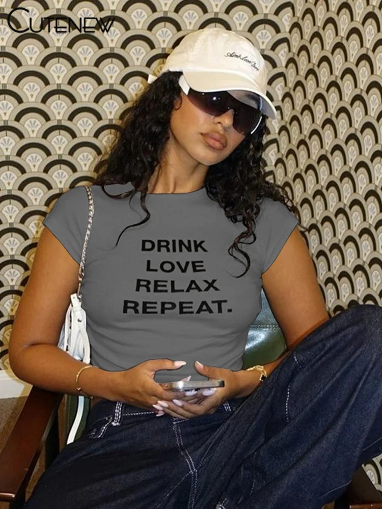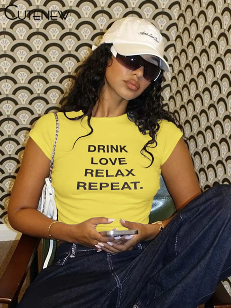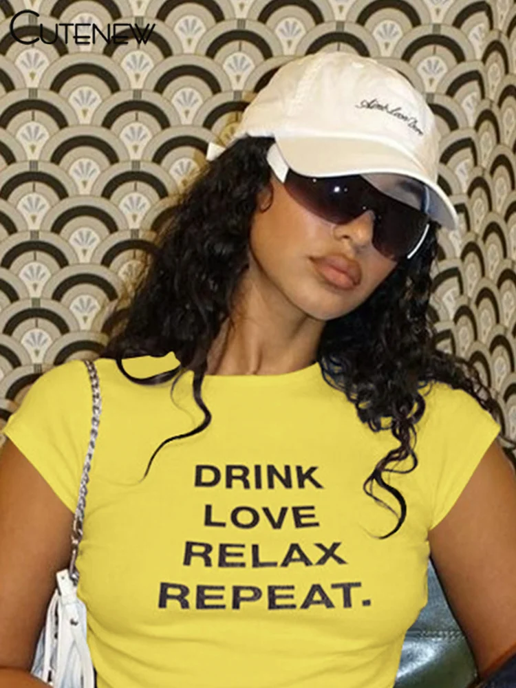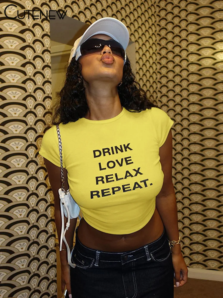 Cutenew Letter Print T-shirts Women Casual Wild Summer New Short Sleeve Shirring Slim Crop Tees Female Classic Basic Streetwear