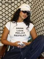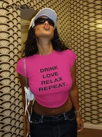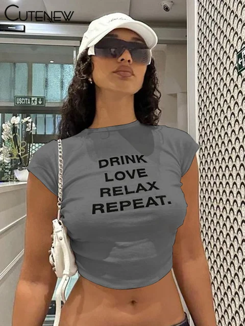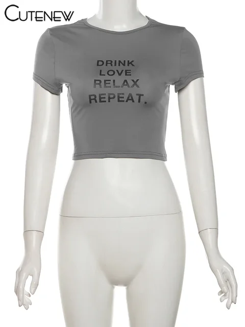 Cutenew Letter Print T-shirts Women Casual Wild Summer New Short Sleeve Shirring Slim Crop Tees Female