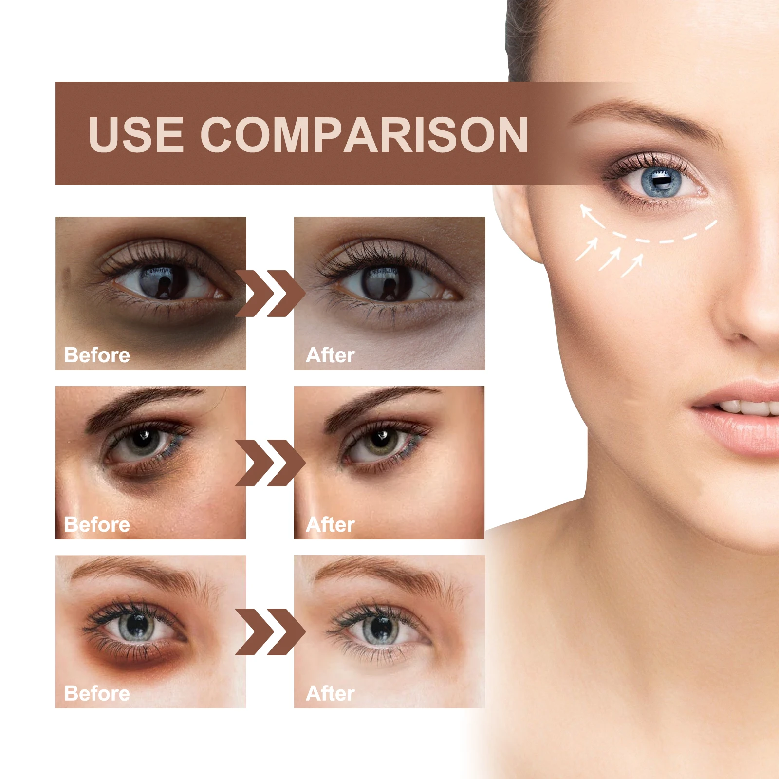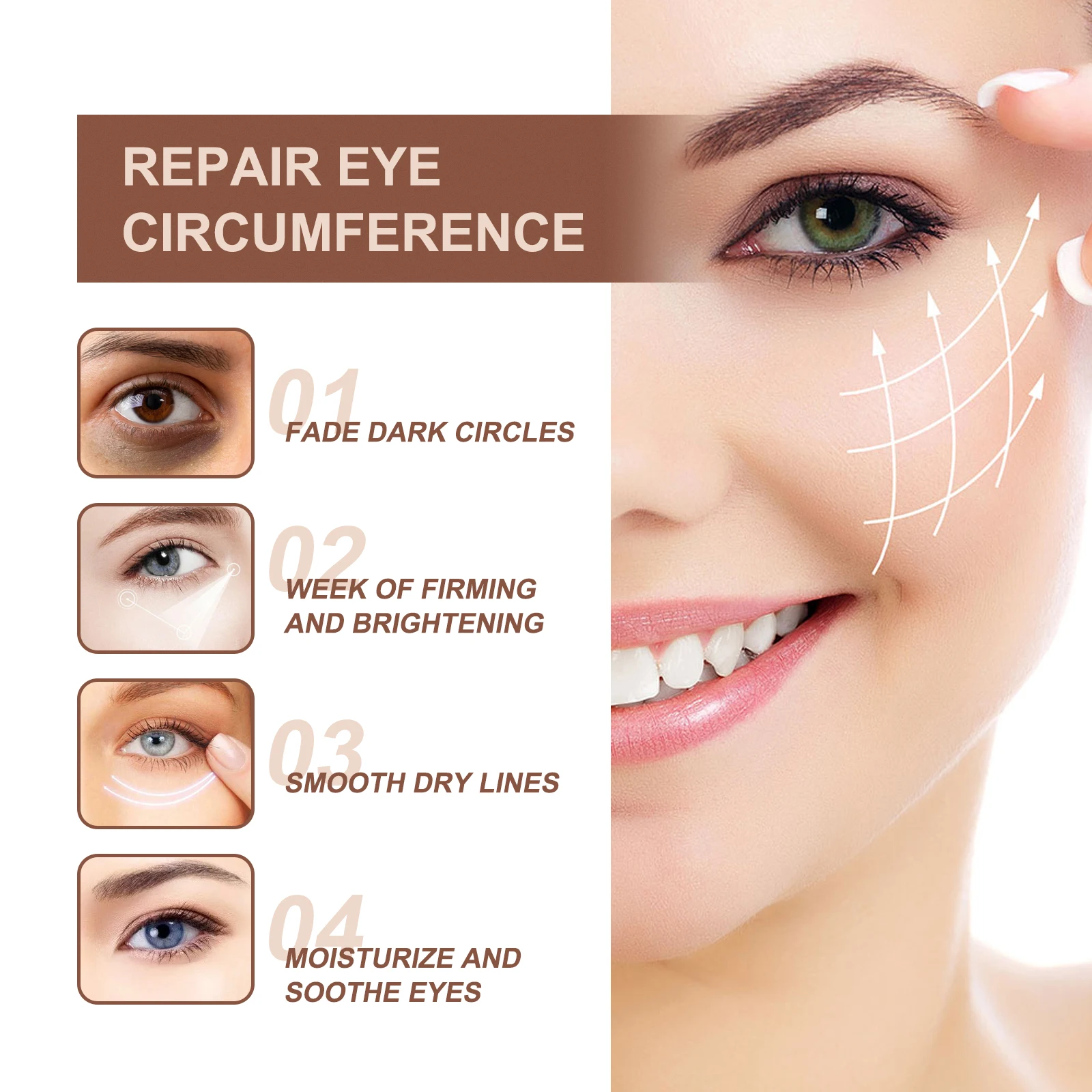 1.In the morning and evening , apply a small amount of it around the eyes to make it smooth until it is absorbed . so as to eliminate wrinkles , dark circles and tired eyes