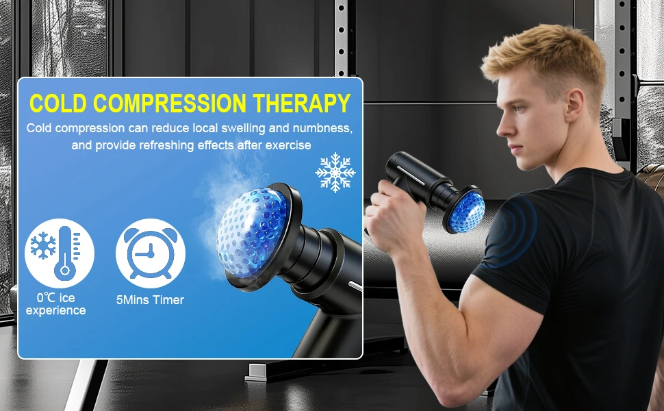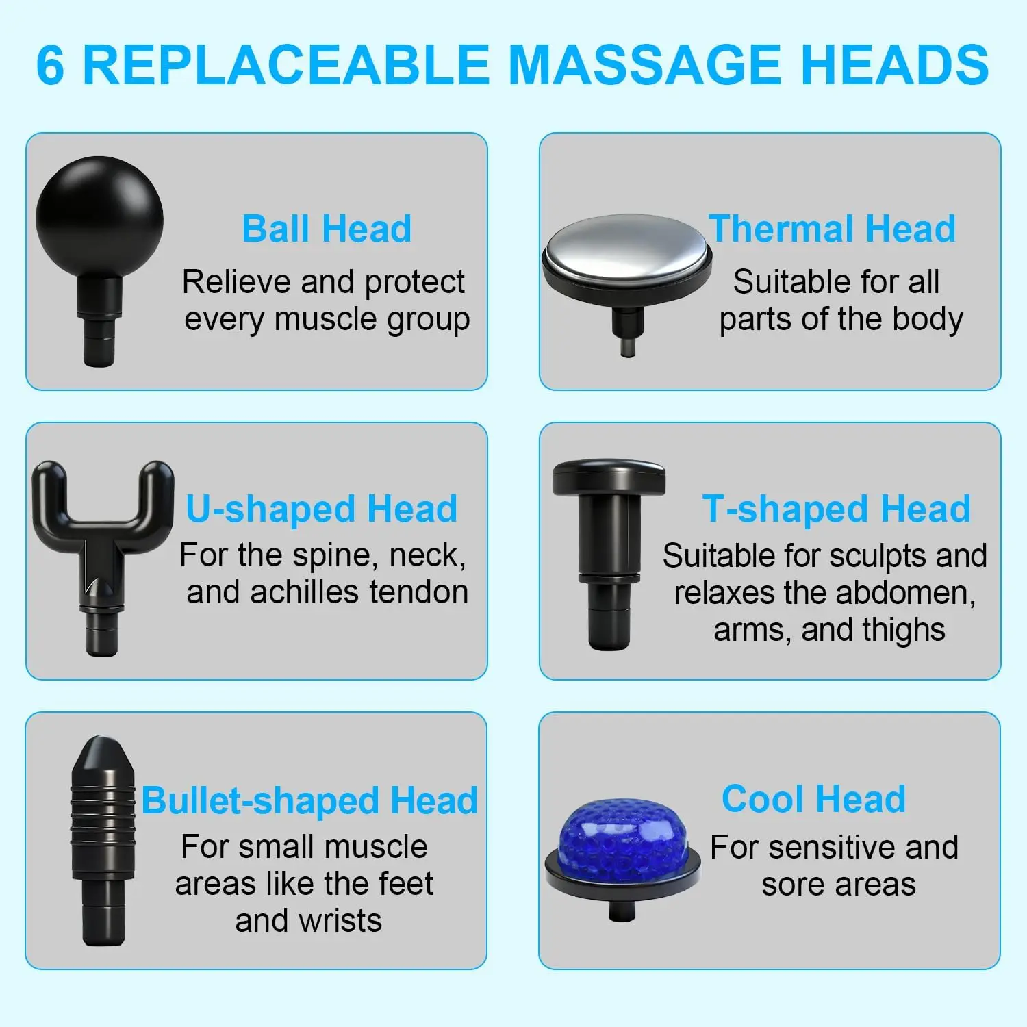 3.【Versatile Massage Heads for Targeted Relief】With 6 interchangeable massage heads, including heat and cold options, this massage gun is perfect for targeting different muscle groups. Whether you need a gentle massage for sensitive areas or deep tissue relief, these ergonomically designed heads provide a customized experience for optimal relaxation and pain relief.