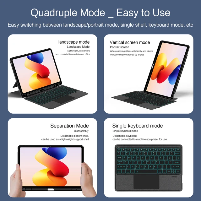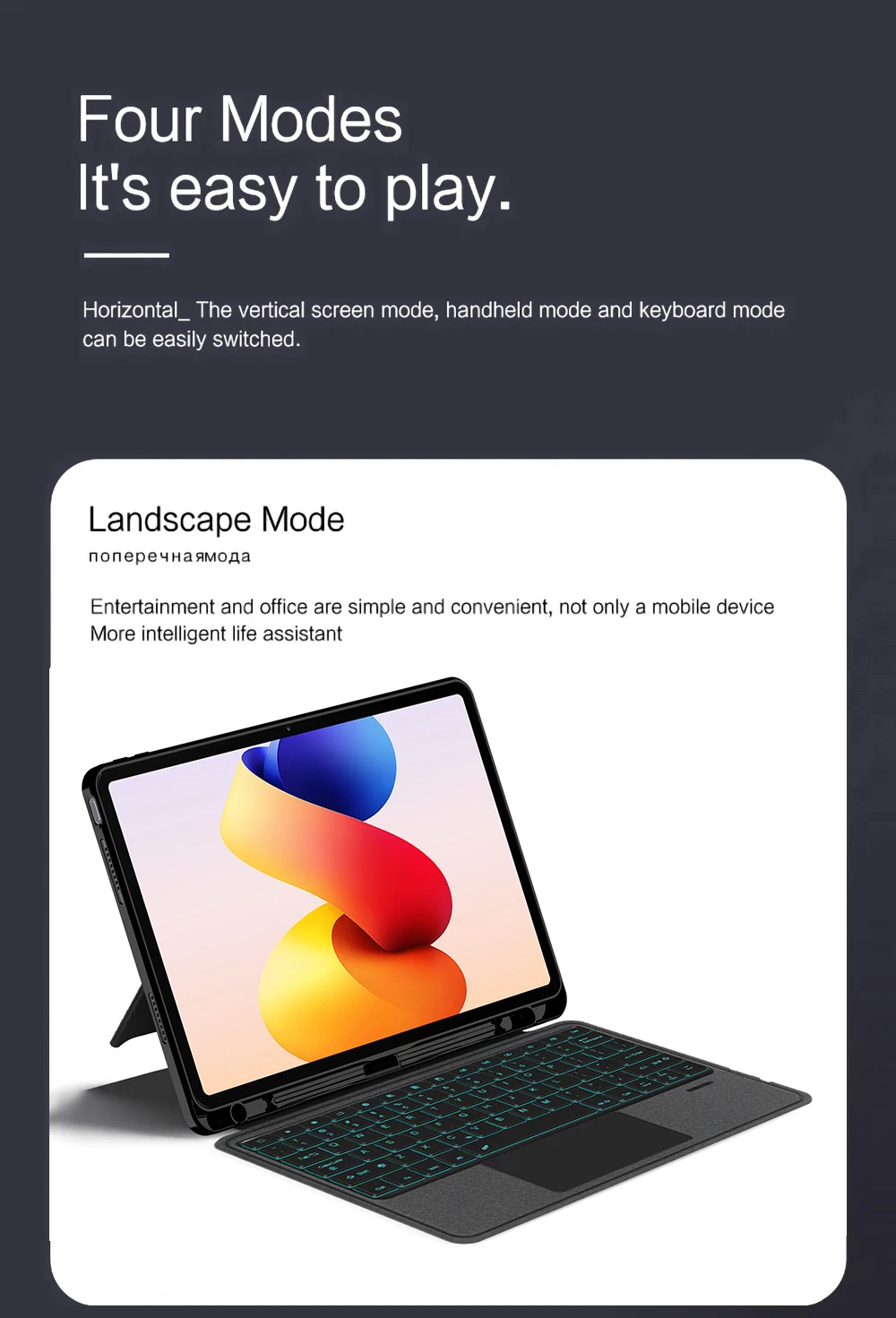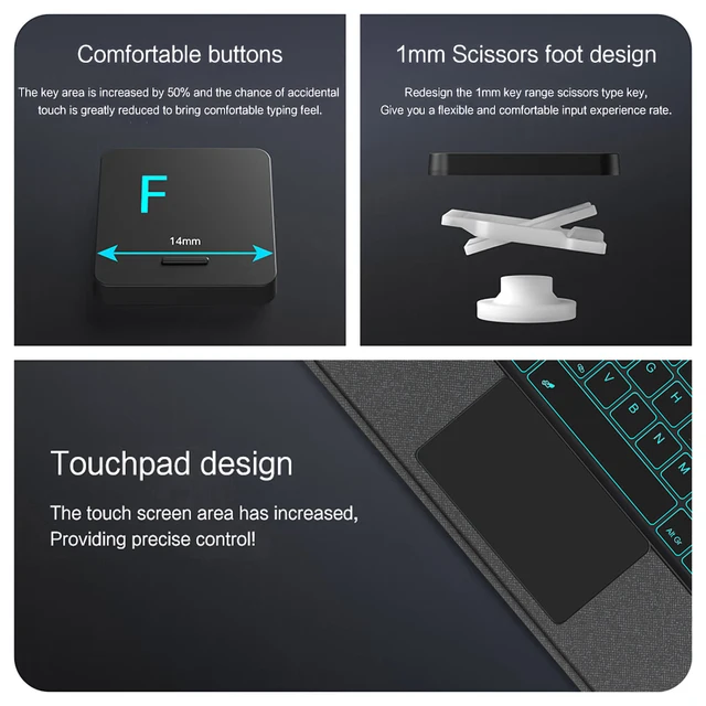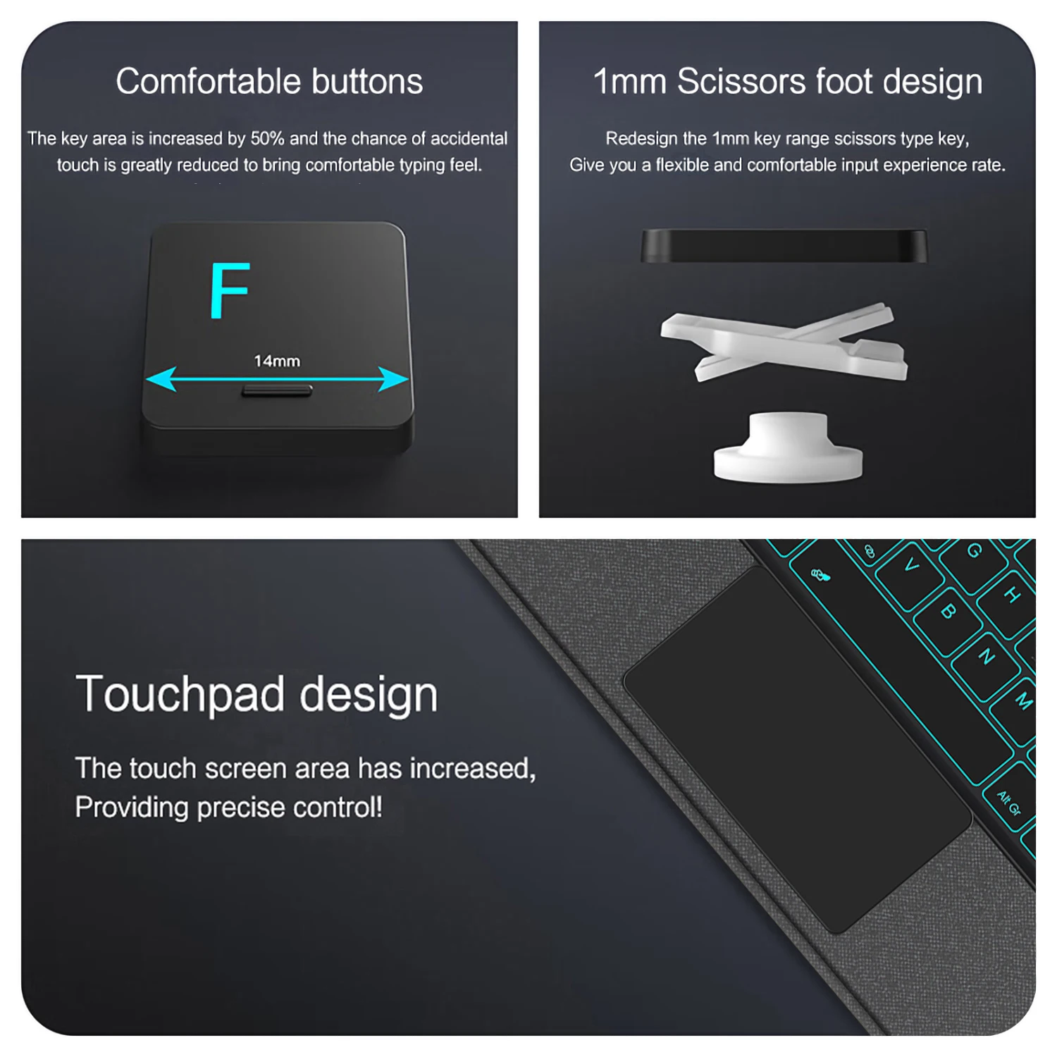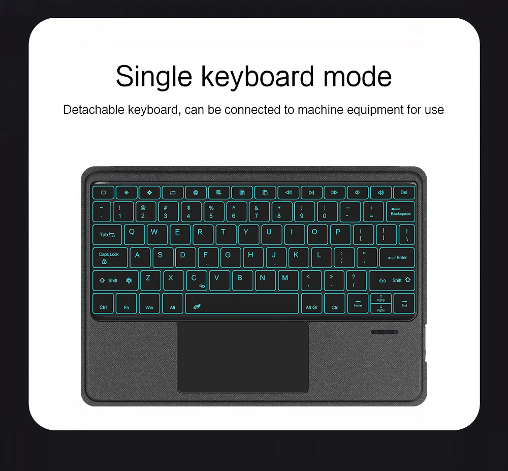 This is an detachable keyboard case, TPU soft shell protective case, which can effectively protect your tablet. The keyboard and protective case can be separated .Keyboard with Backlight and TouchPad.
