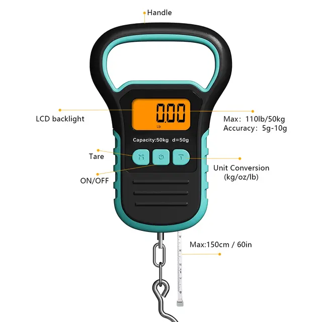 【LCD Backlight & Multi-function Display】The fishing postal hanging hook scale adopts LCD orange backlit display with clear readings, making it easy to read the data even in the dark. The IPX4 waterproof fishing scale also supports low battery display and overload indication, which is convenient for you to replace the battery in time and use it correctly, and prolong the service life of the product (included 2*AAA batteries and 1 *screwdriver).