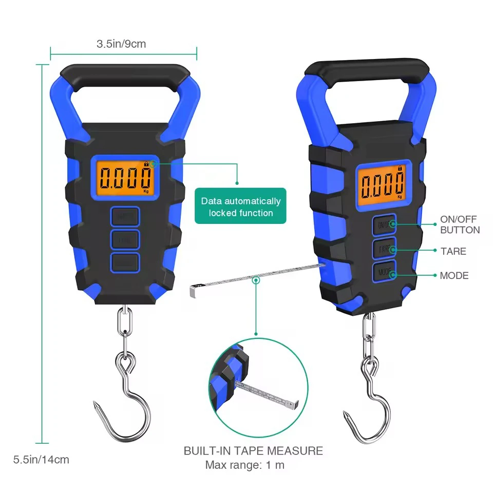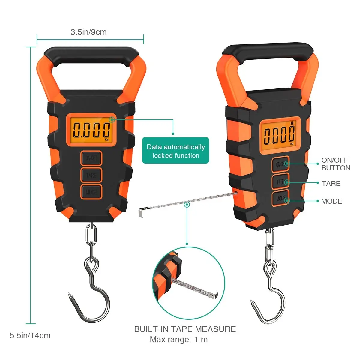 【Non-slip Handle & Tape Measure Design】The waterproof fishing scale adopts a high-strength ABS frame, which is not easy to damage. The sides and handshake are coated with a non-slip process. Not only can this be used as a fishing scale, it comes with a 38-inch retractable tape measure and a strong stainless steel hook, you can use it to check the size of luggage, measure the packaging of express parcels, and it can also be used for daily shopping and weighing.