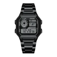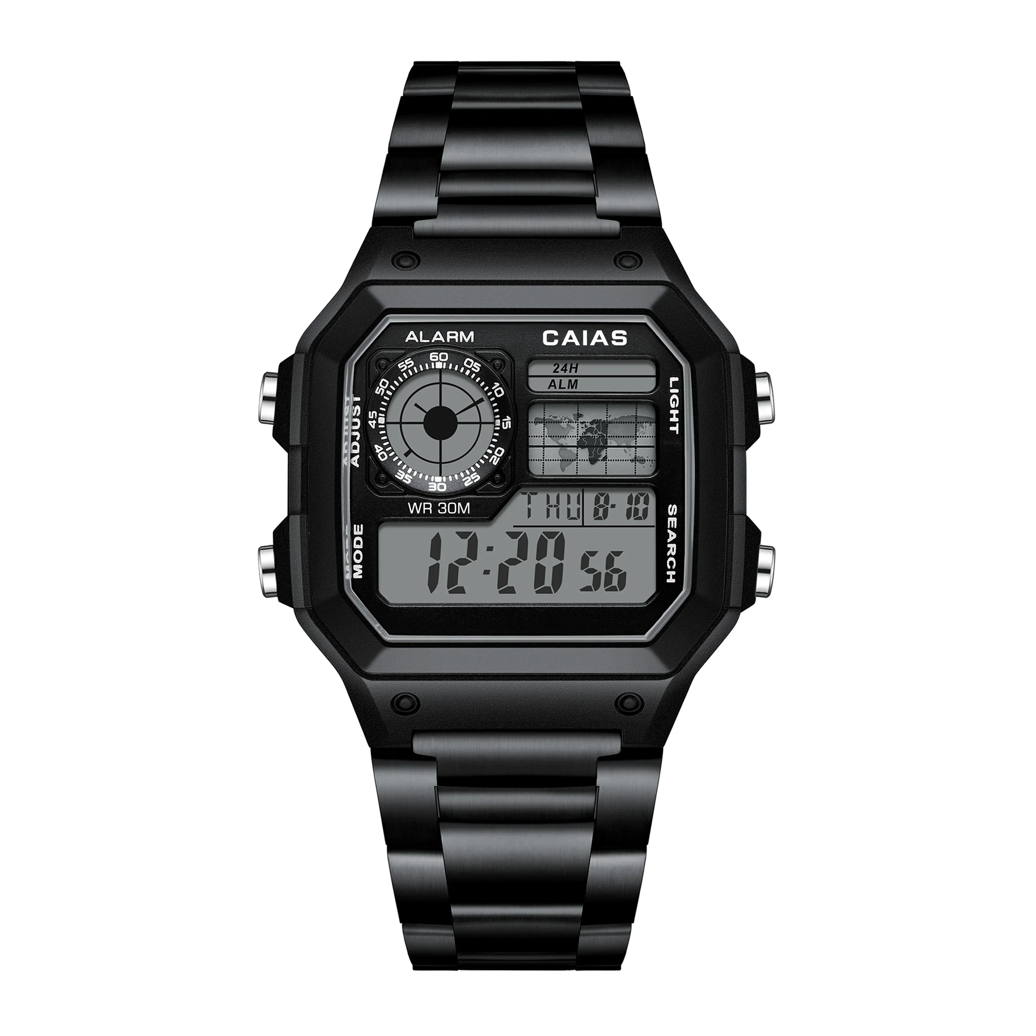 Digital Sports Electronic Unisex Watch World Time Fully Functional Steel Strap Alloy Band LED Oak 1200
