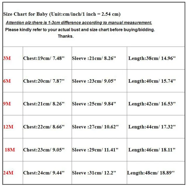 | Size Chart for Baby (Unit:cm/inch/1 inch = 2.54 cm)   Attention plz:there is 1-3cm difference according to manual measurement.  Please kindly refer to your actual bust and size chart before buying/bidding.                                         Thanks. |