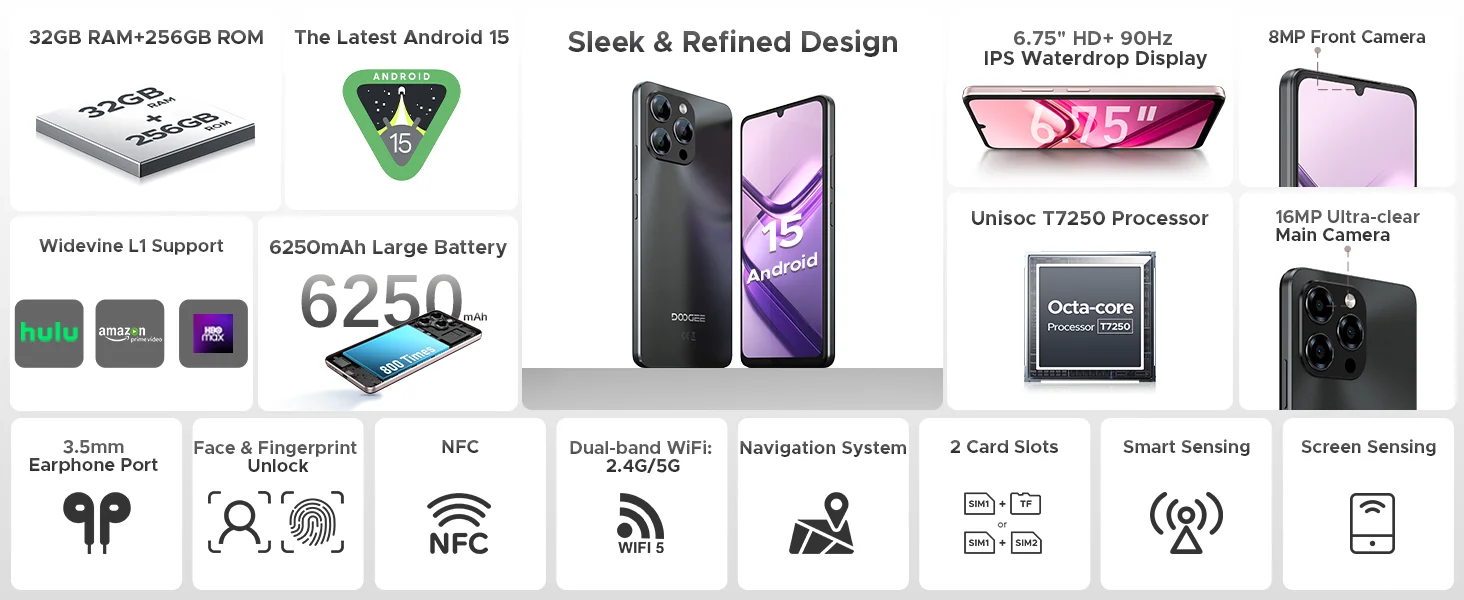Powerful Unisoc T7250 Octa-core Processor丨6.75″ HD+ 90Hz IPS Waterdrop Display