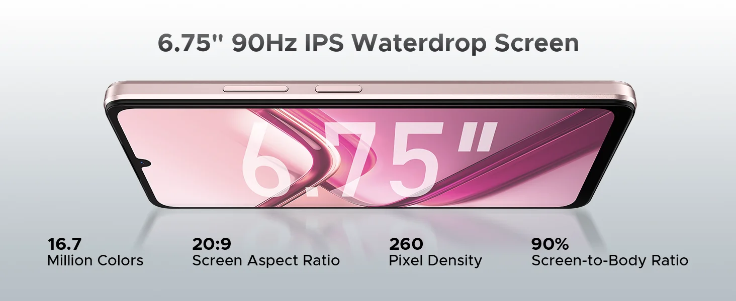 6.75″ HD+ 90Hz IPS Waterdrop Screen |