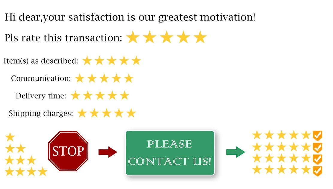 Dear Buyers, your satisfaction and positive feedback is very important . Please leave positive feedback and 5 stars if you are satisfied with our products and service,that’d be appreciated!If you find any problems after receiving the goods, Please immediately contact us and show some pictures, and then we must try our best to figure out how to help you!Will give you the most satisfactory solution.