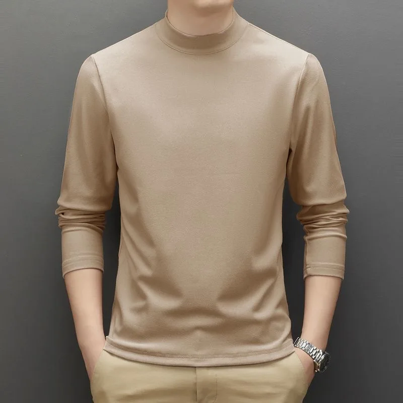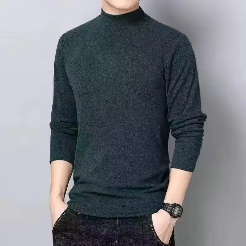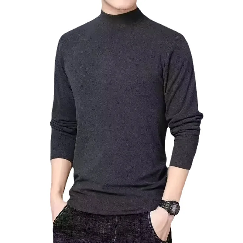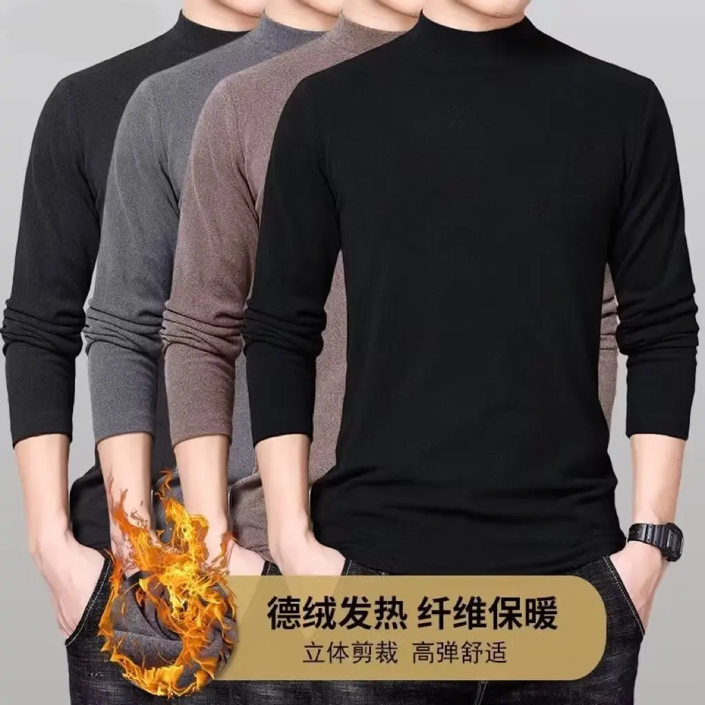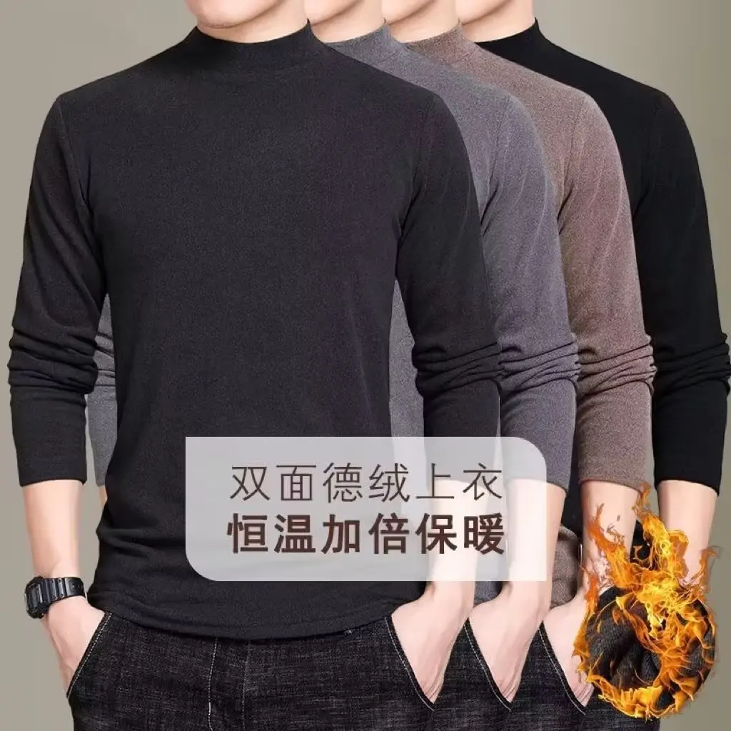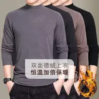 Fleece-Lined Warm Men's Round Neck T-Shirt Base Layer Top Long Sleevet Autumn/Winter Solid Color Double-Sided Fleece Body Shirt