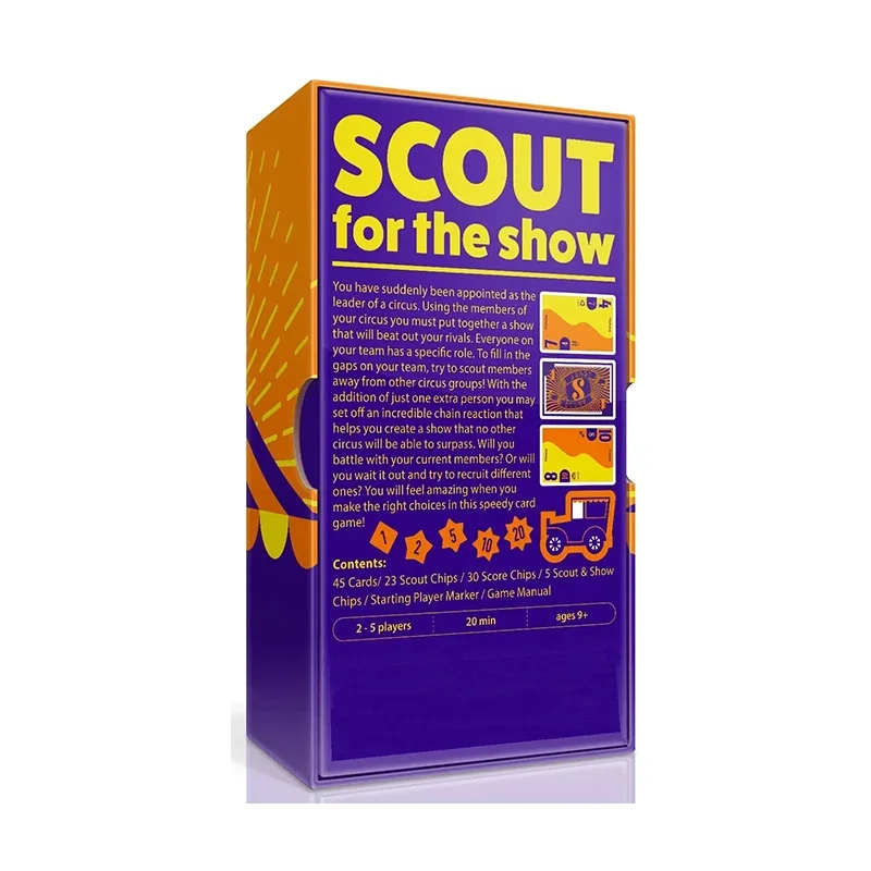 You have suddenly been appointed as the leader of a circus. Using the members of your circus you must put together a show that will beat out your rivals. Everyone on your team has a specific role. To fill in the gaps on your team, try to scout members away from other circus groups! With the addition of just one extra person you may set off an incredible chain reaction that helps you create a show that no other circus will be able to surpass. Will you battle with your current members? Or will you wait it out and try to recruit different ones? You will feel amazing when you make the right choices in this speedy card game!