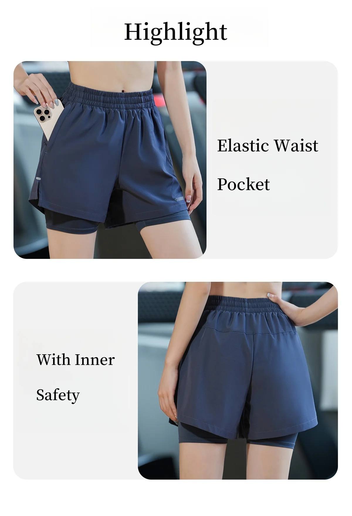 4. Inner layer Spandex Shorts, it makes you look more beautiful while exercising, and protects your privacy.