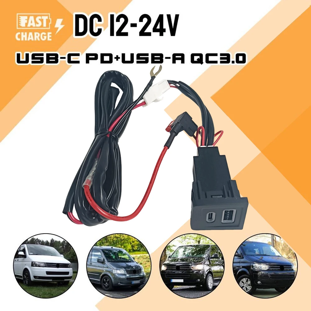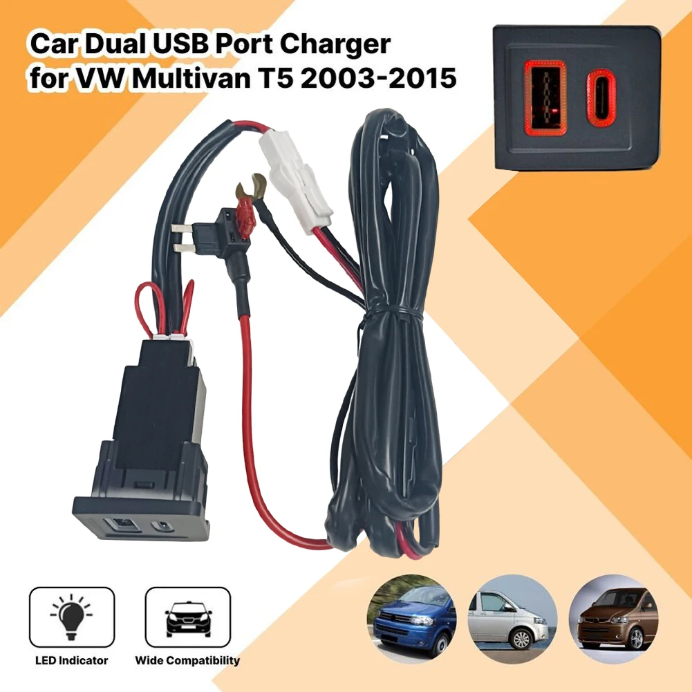 Dual USB USB C Car Charger PD+QC3.0 Phone Charge Power Adapter Outlet Quick Charging Auto Phone Adapter for VW Multivan T5 03-15