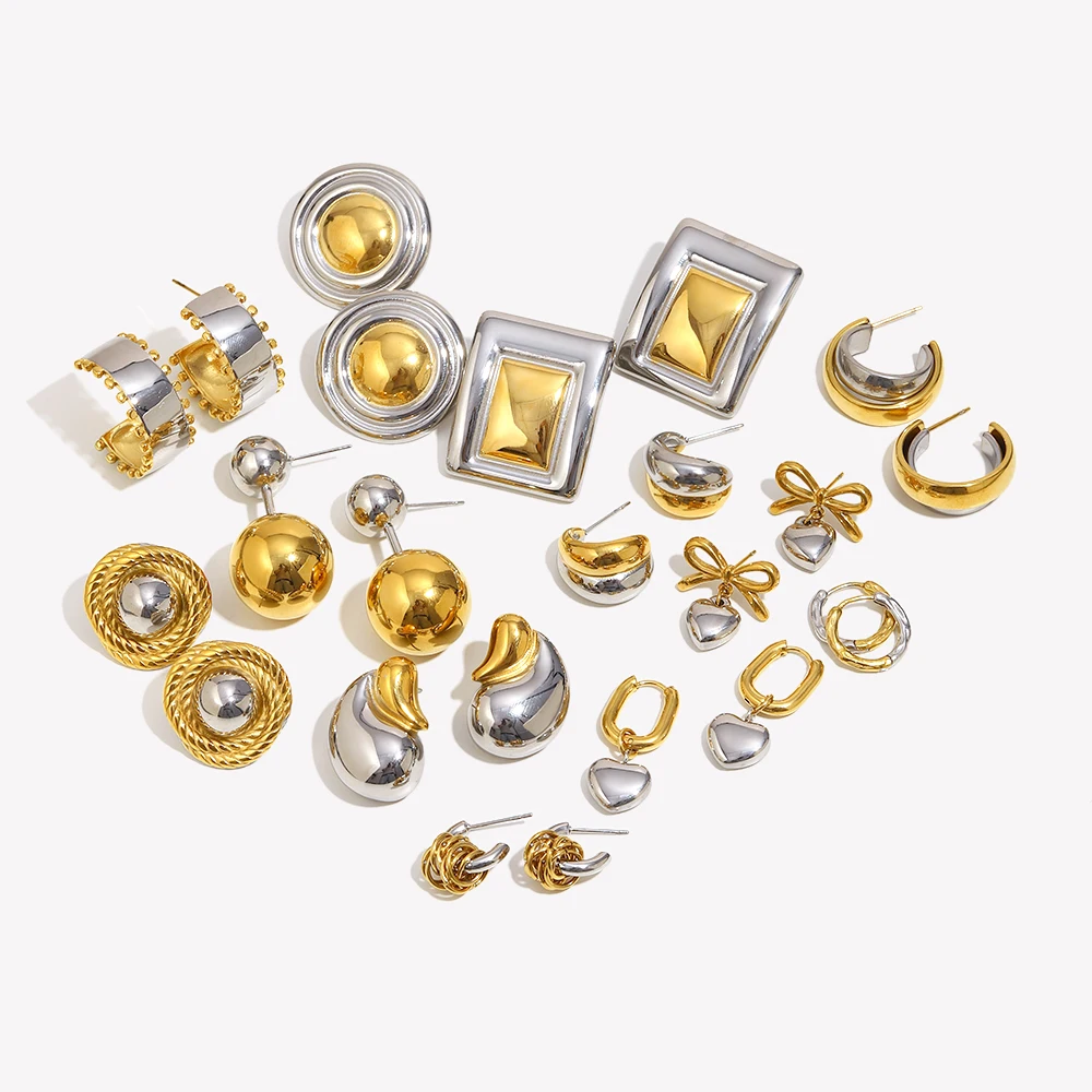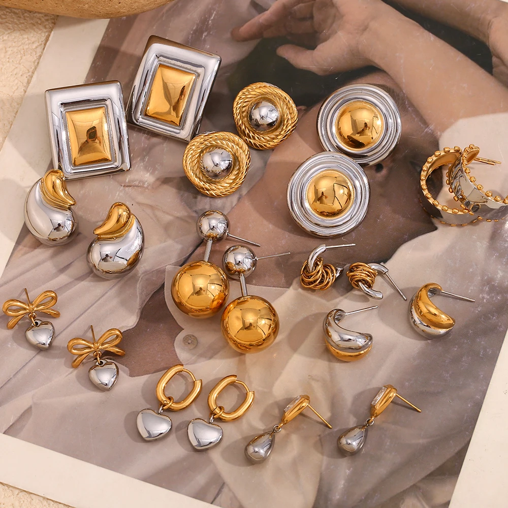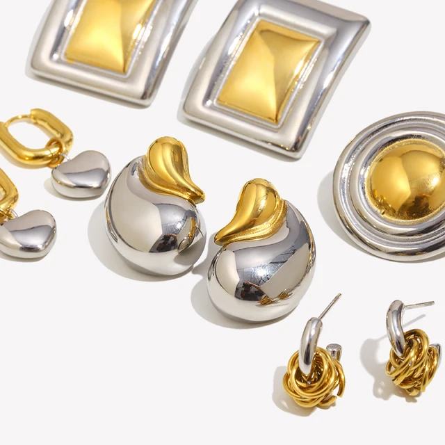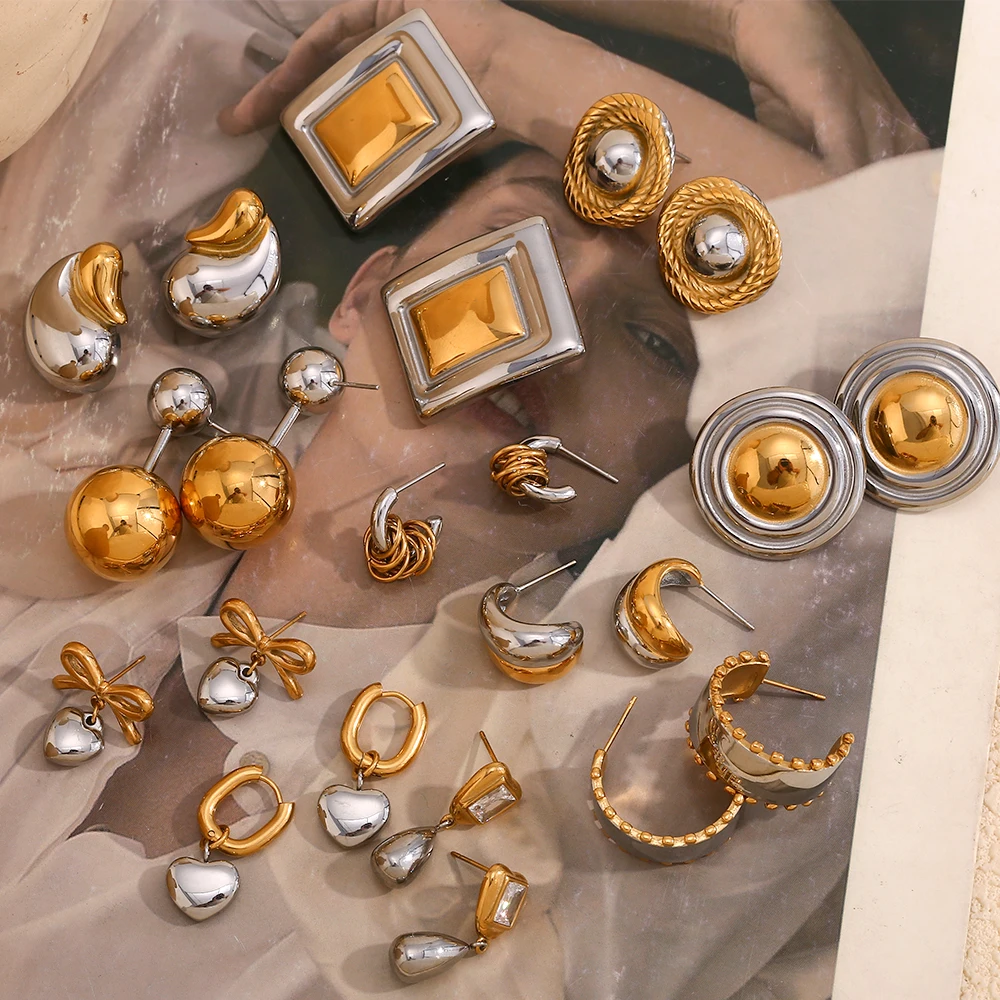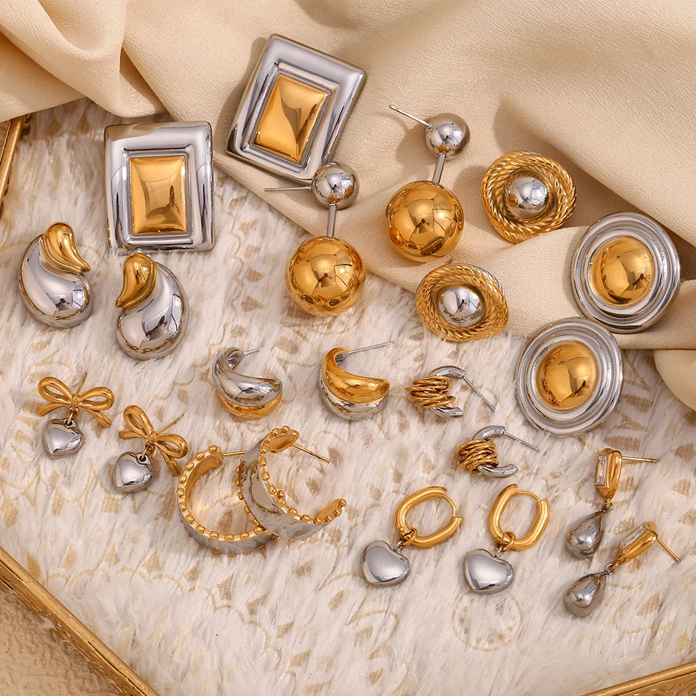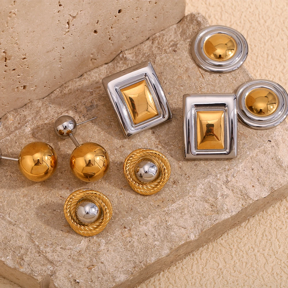 E.B.belle Double Gold Silver Color Square Round Heart Stud Earring Stainless Steel 18k Gold Plated Waterproof