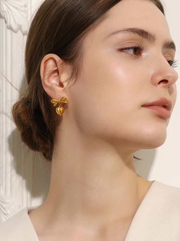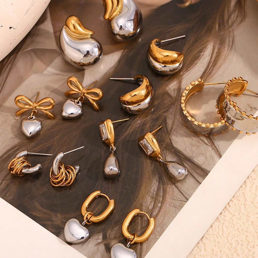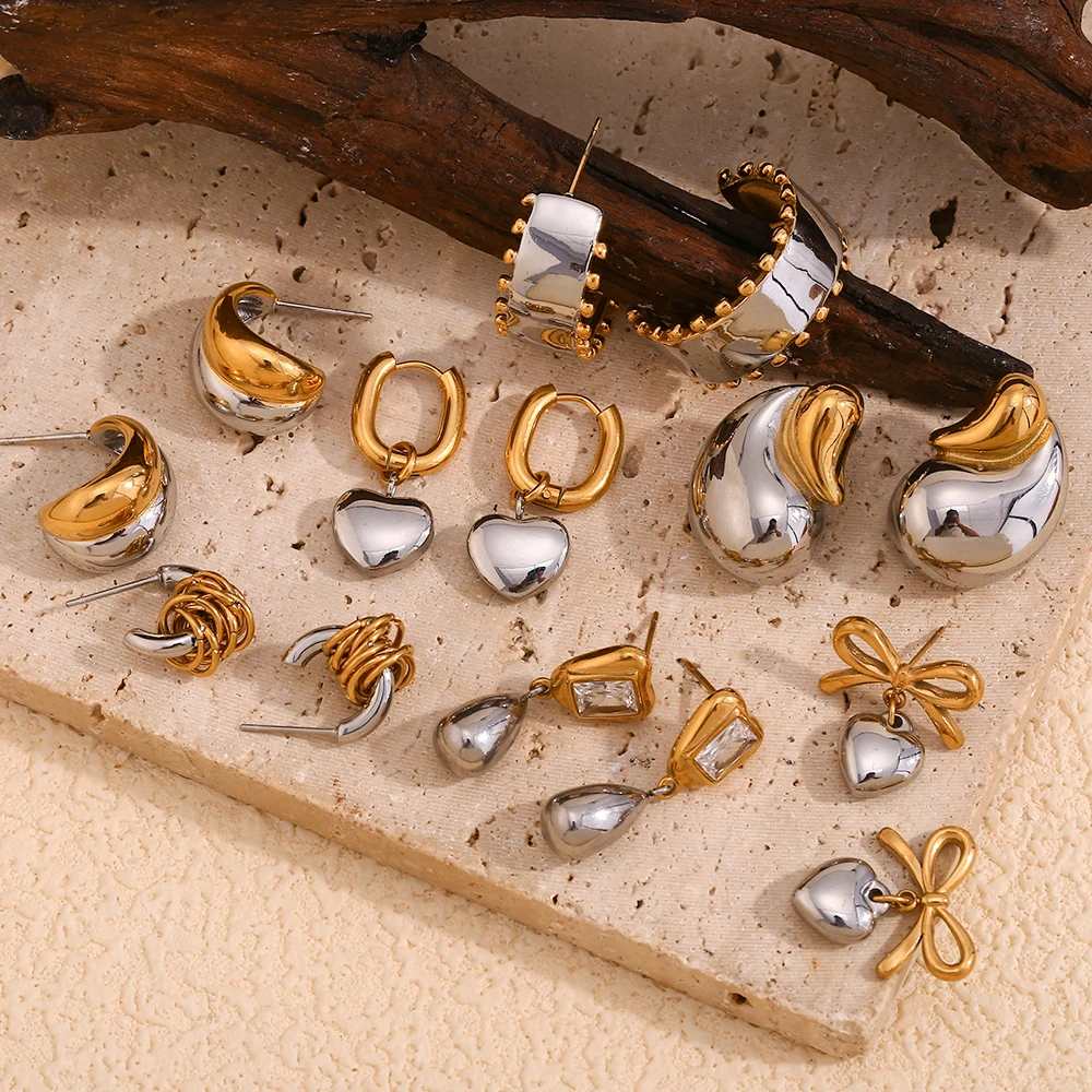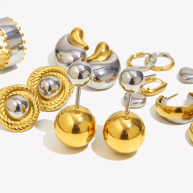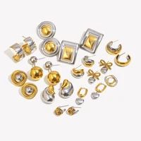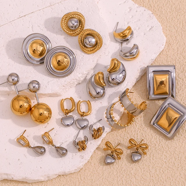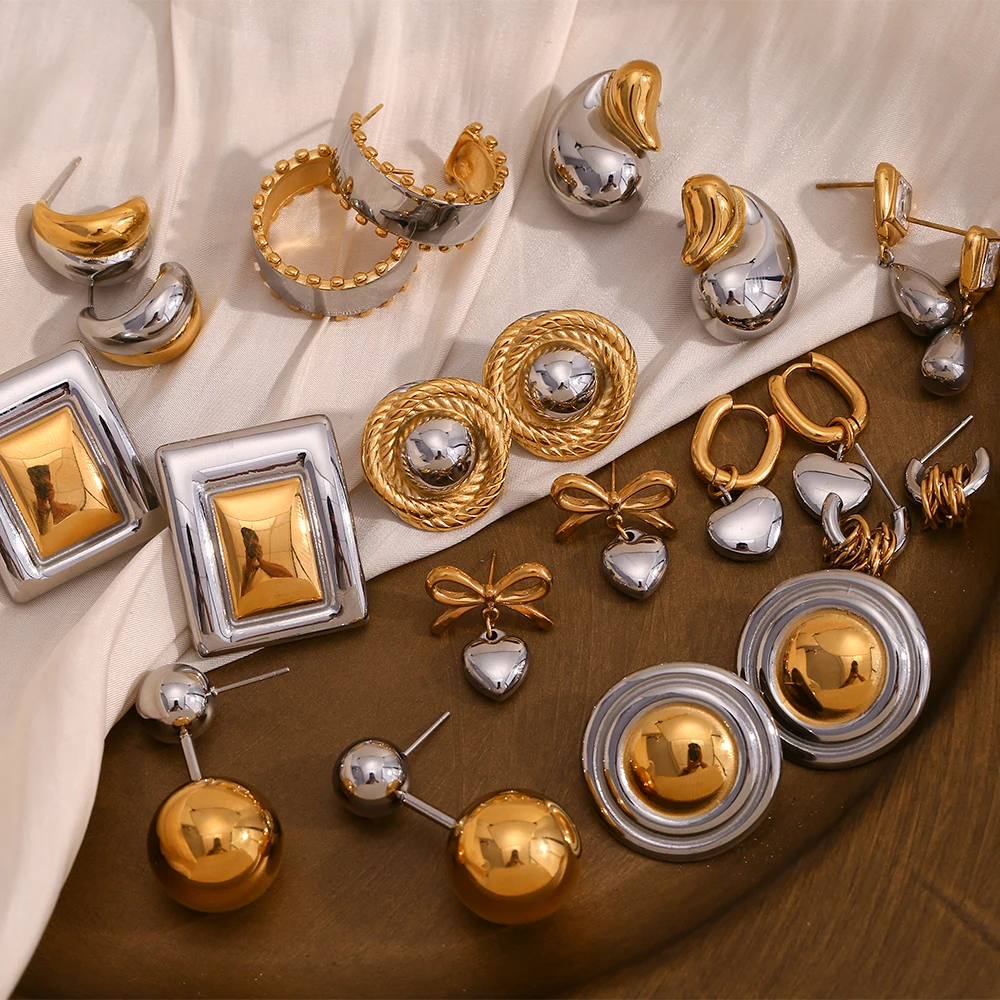 E.B.belle Double Gold Silver Color Square Round Heart Stud Earring Stainless Steel 18k Gold Plated Waterproof