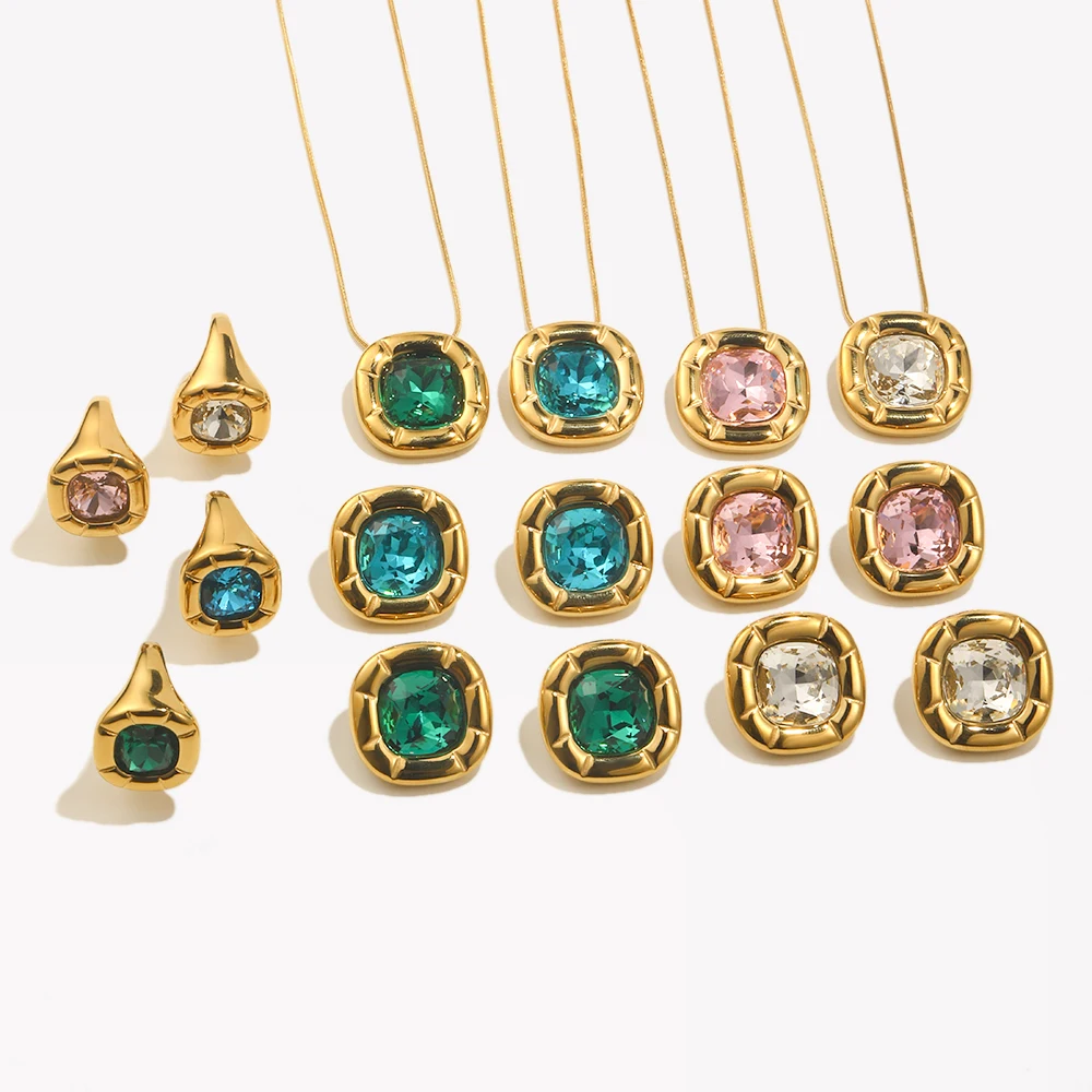E.B.belle Round Square Flower Zircon Earrings Necklace Ring Tarnish Free Stainless Steel Women’s