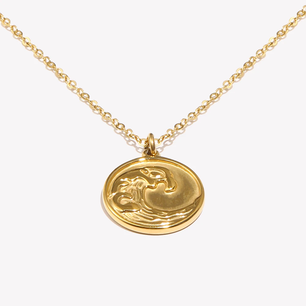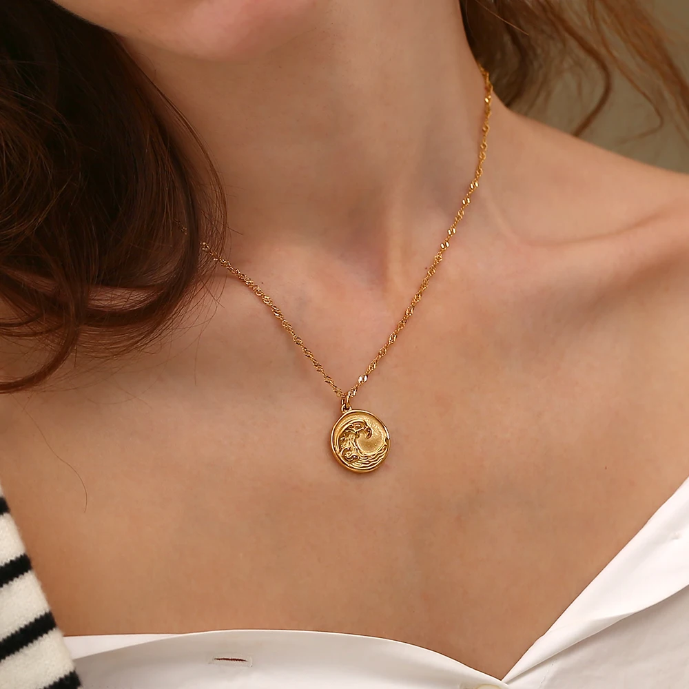 E.B.belle Tarnish Free Stainless Steel 18k Gold Plated Golden Sea Wave Necklace Stereoscopic Coin Necklaces For Women