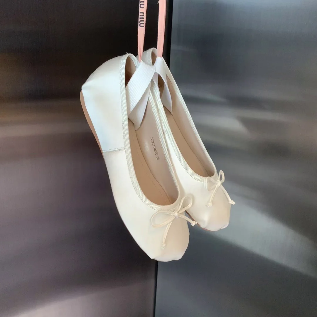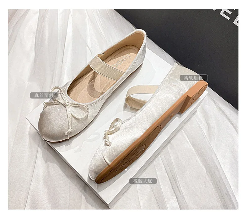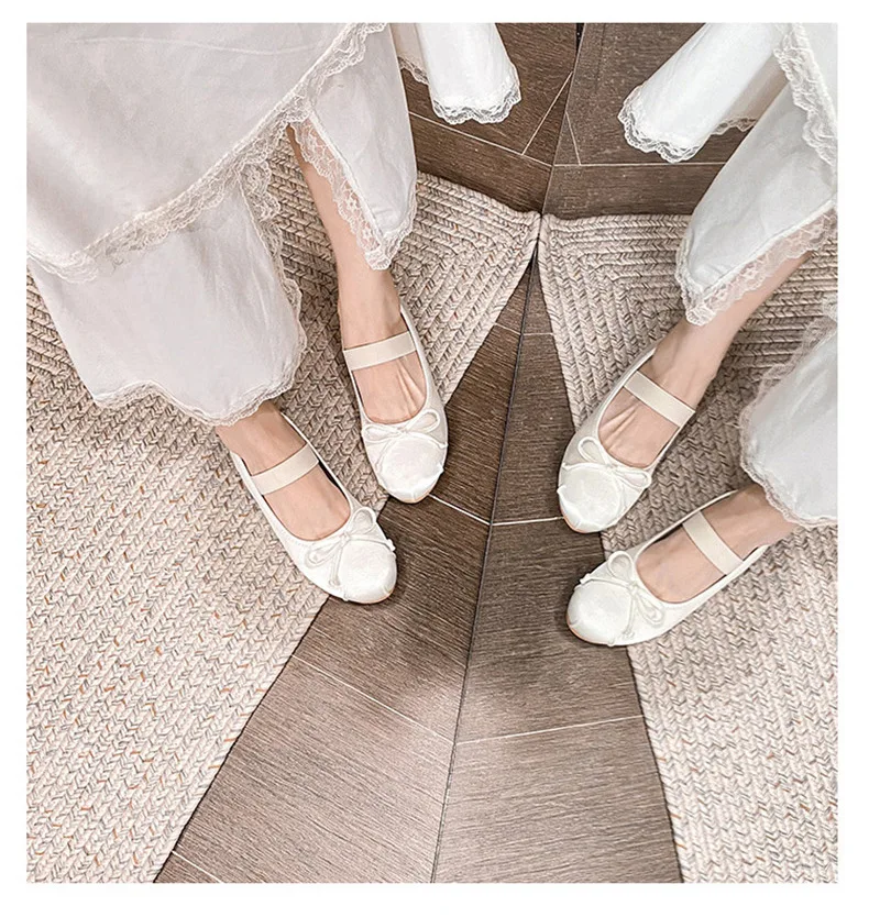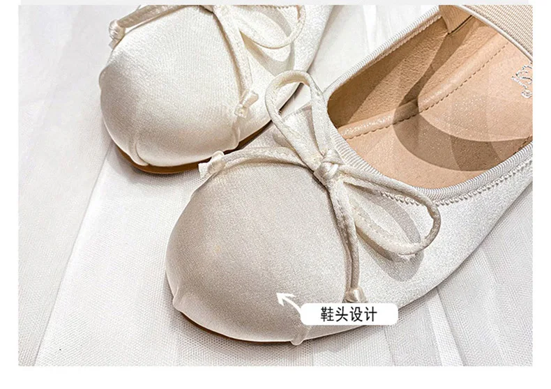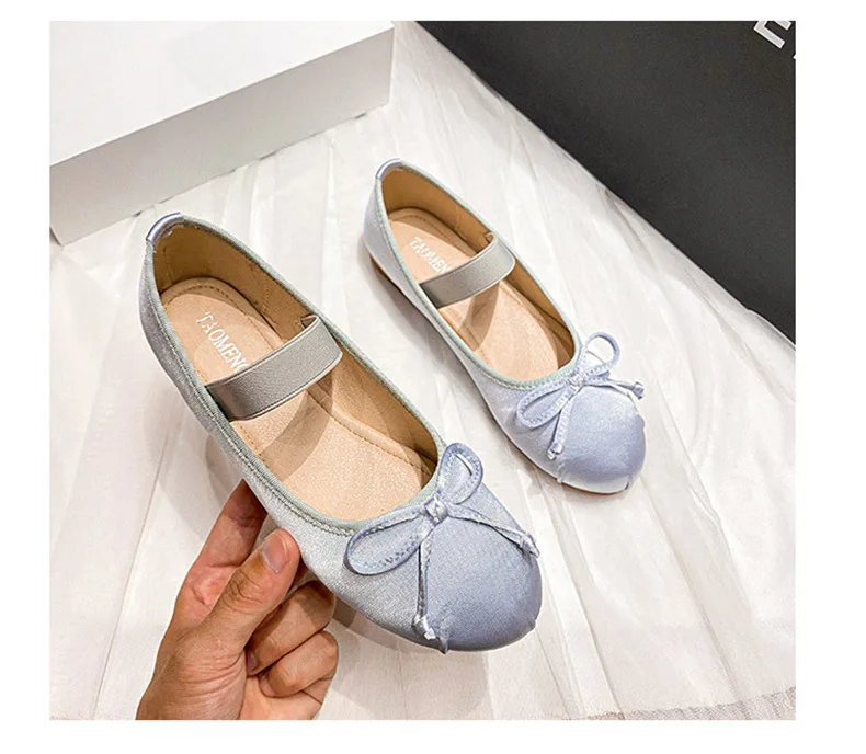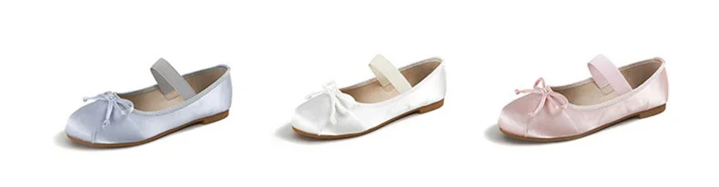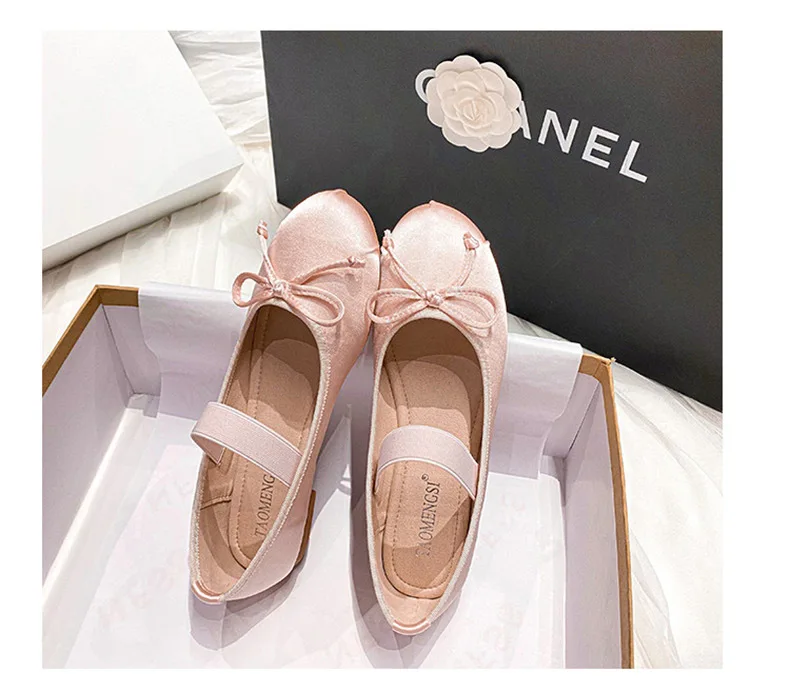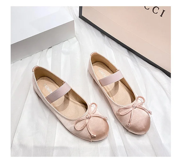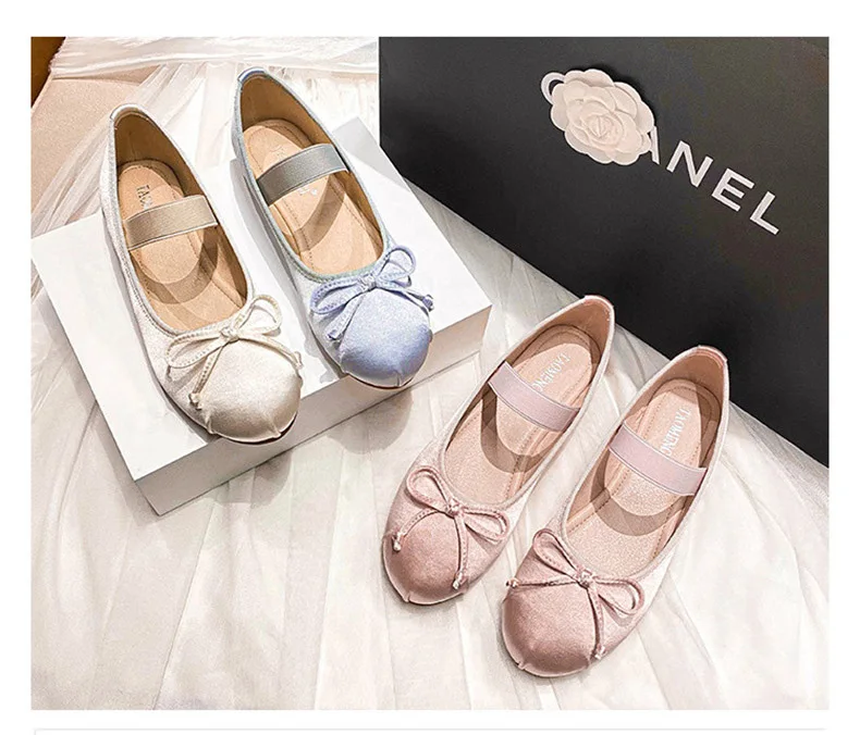 Elastic Band Silk bowtie ballet flats women round toe pink bow loafers soft bottom mary janes female