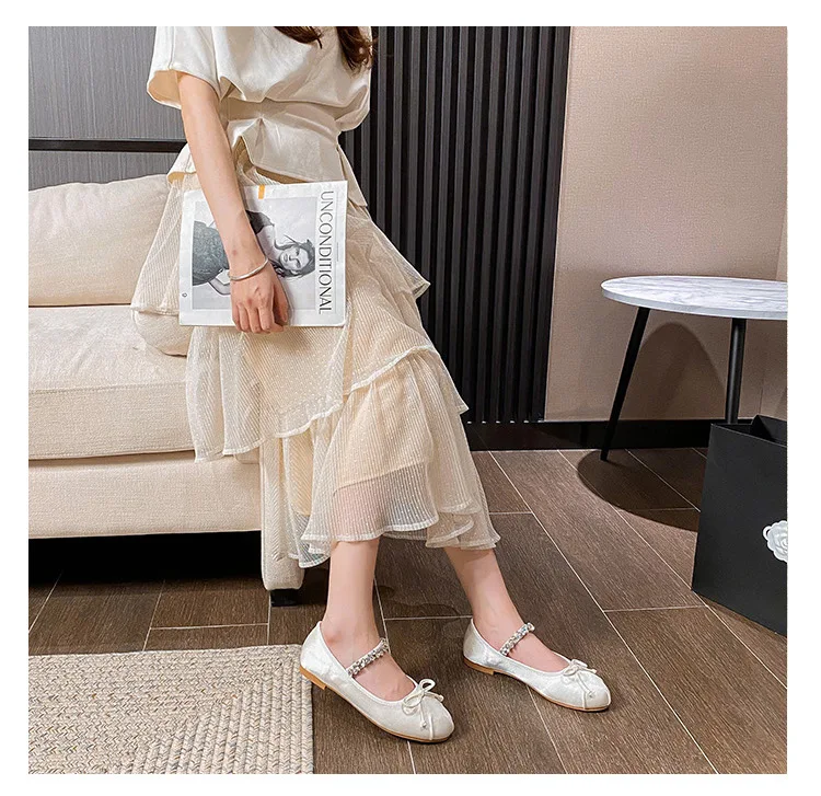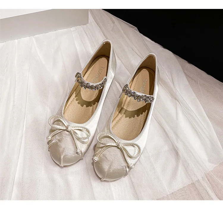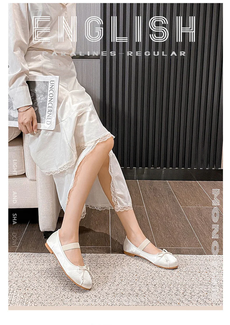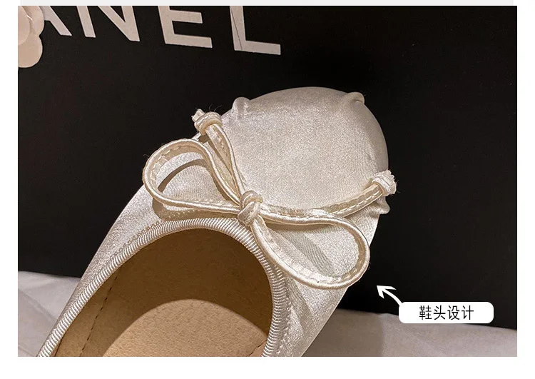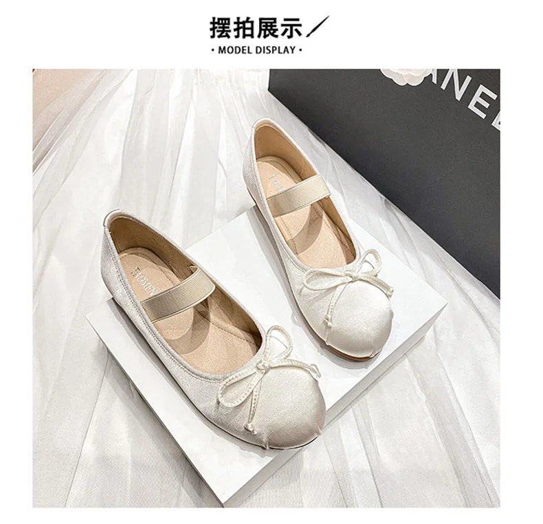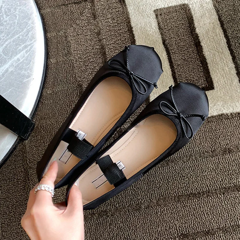 Elastic Band Silk bowtie ballet flats women round toe pink bow loafers soft bottom mary janes female silk moccasins big size 43