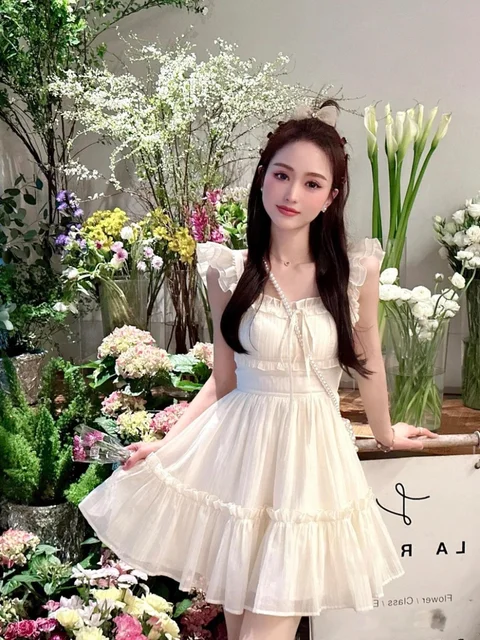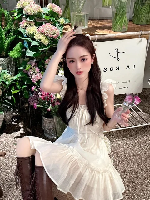Featuring a high-waist, short skirt, and delicate butterfly knot, this dress exudes a sophisticated and youthful charm.