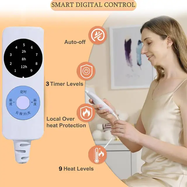 • The electric blanket has 9 levels of temperature adjustment.  You can set the heating levels of the electric blanket according to your personal preferences and ambient temperature to ensure optimal comfort.