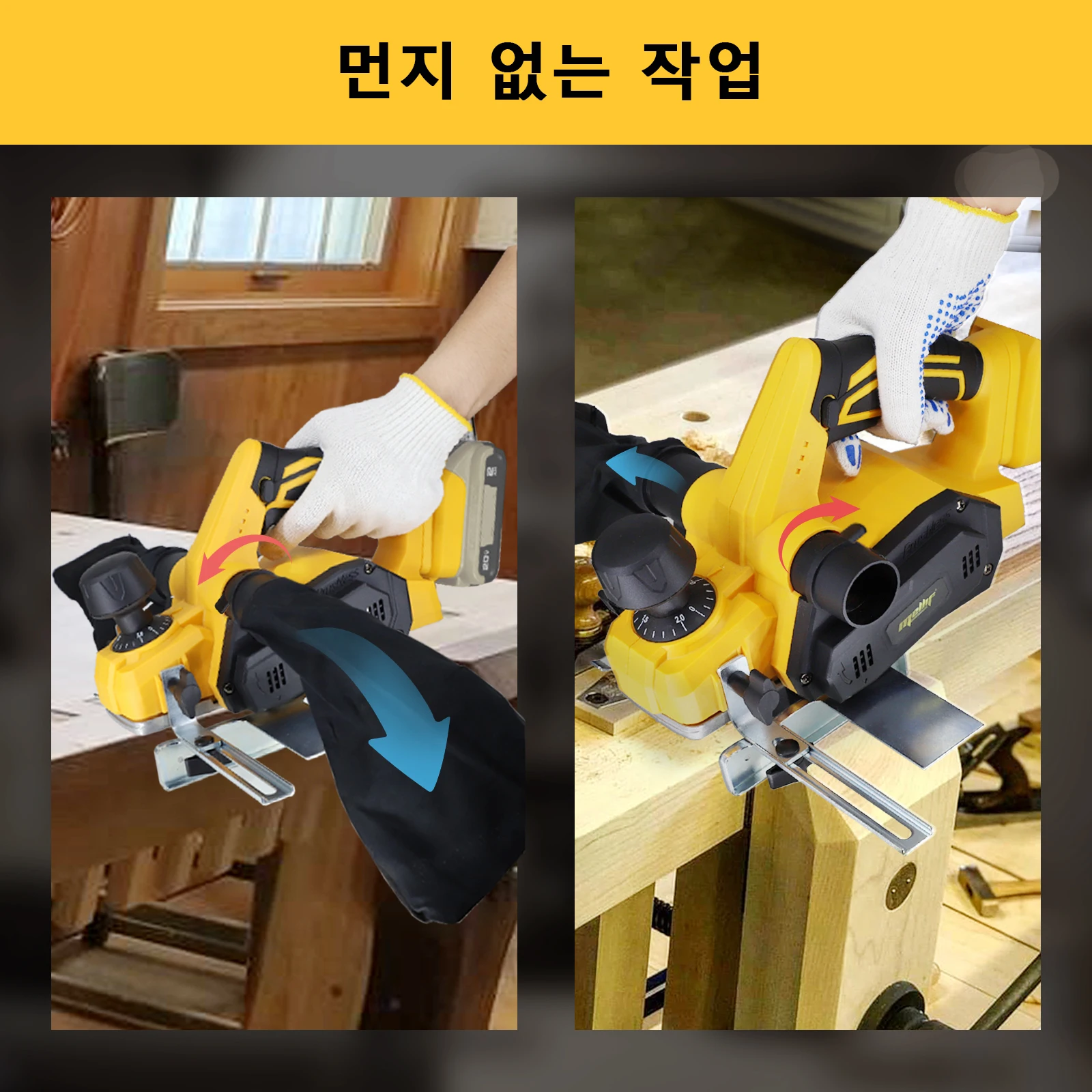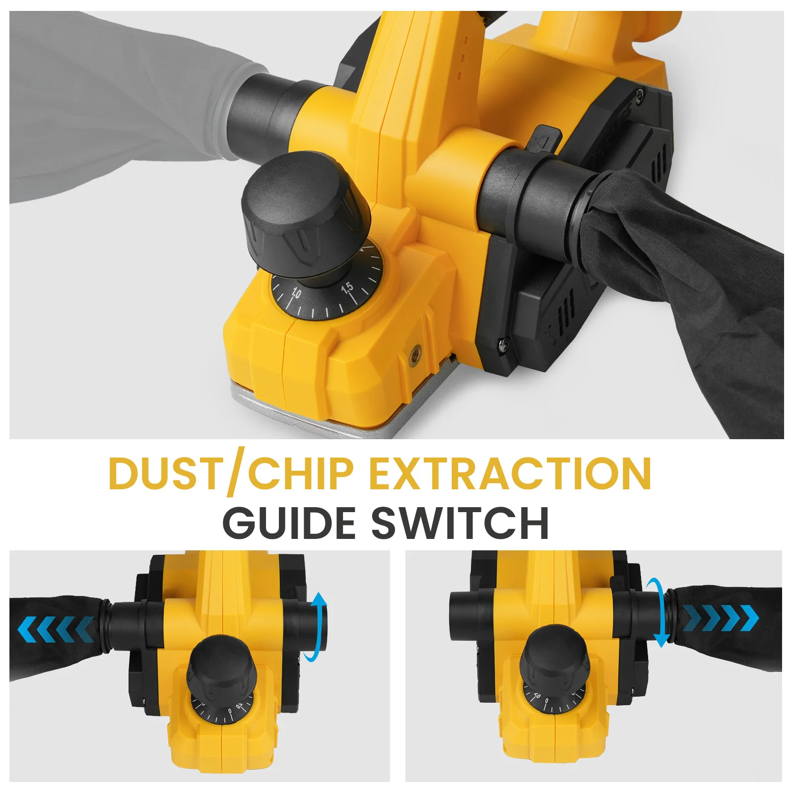 Dual-dust Out System: The woodworking hand planer features dual exhaust ports and a dedicated dust collection chute, designed for use with a vacuum adapter (vacuum not included) or a dust collection bag, which helps maintain a clean and tidy work environment