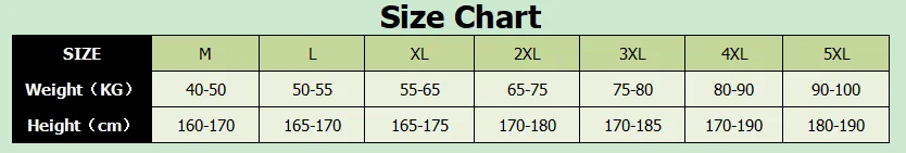 2XL(65-75KG)3XL(75-80KG)4XL(80-90KG)5XL(90-100KG)L(50-55KG)M(40-50KG)XL(55-65KG)