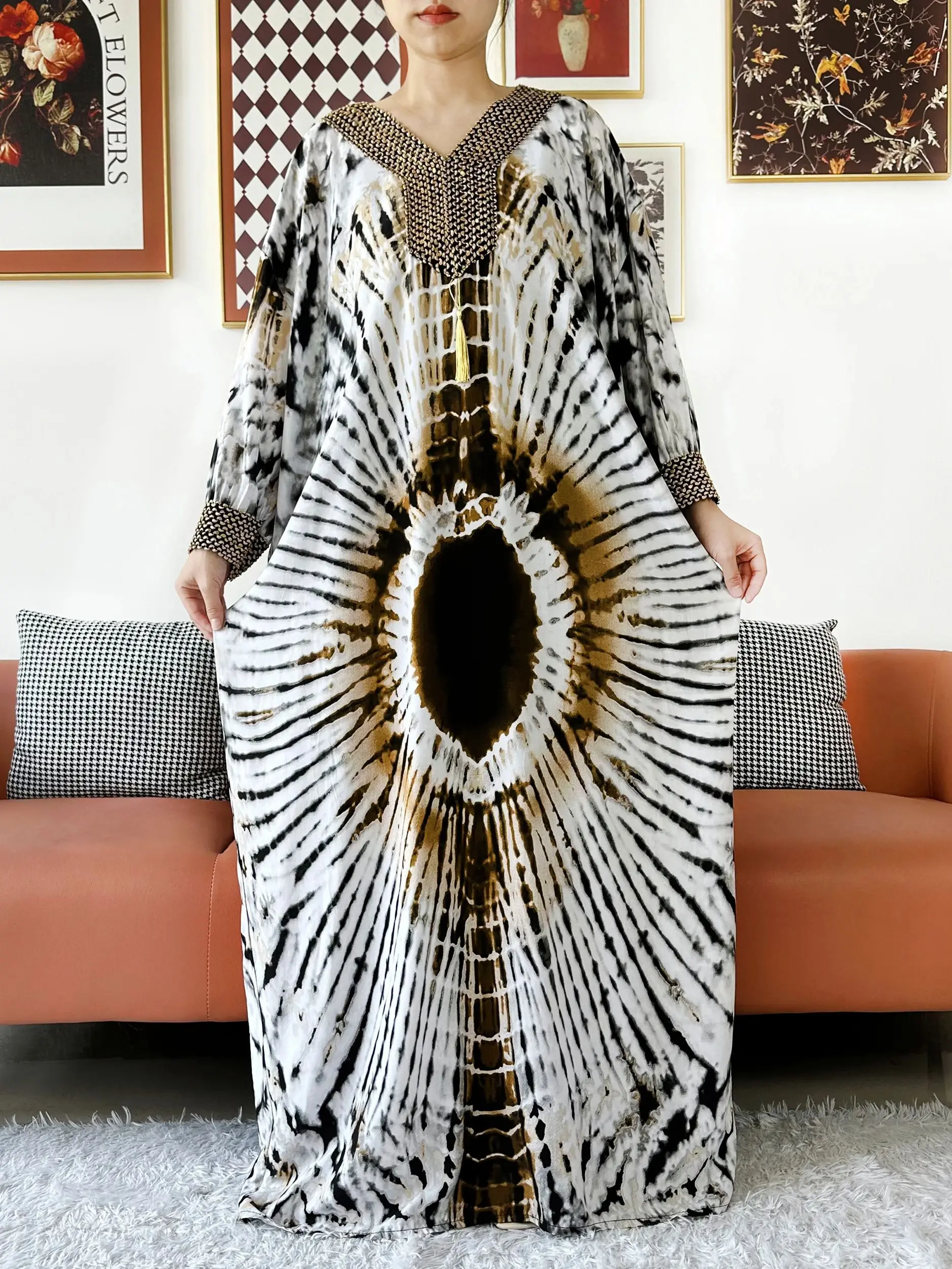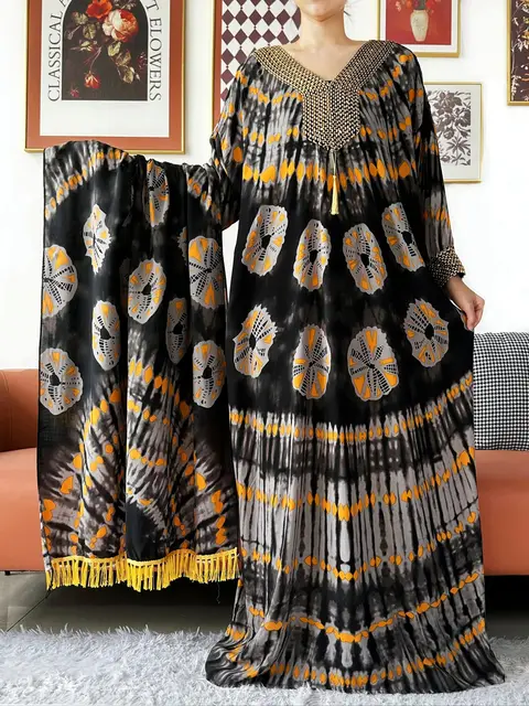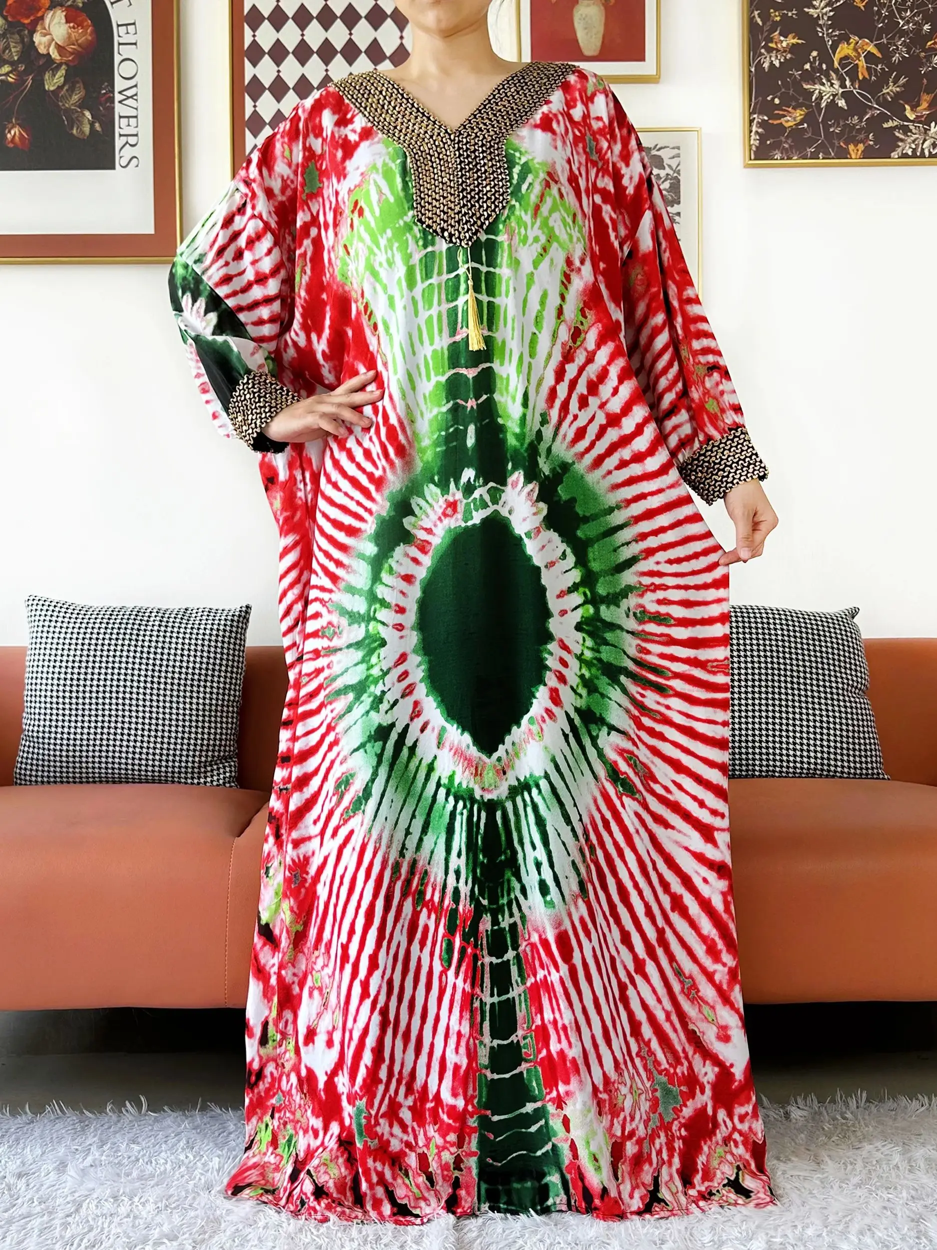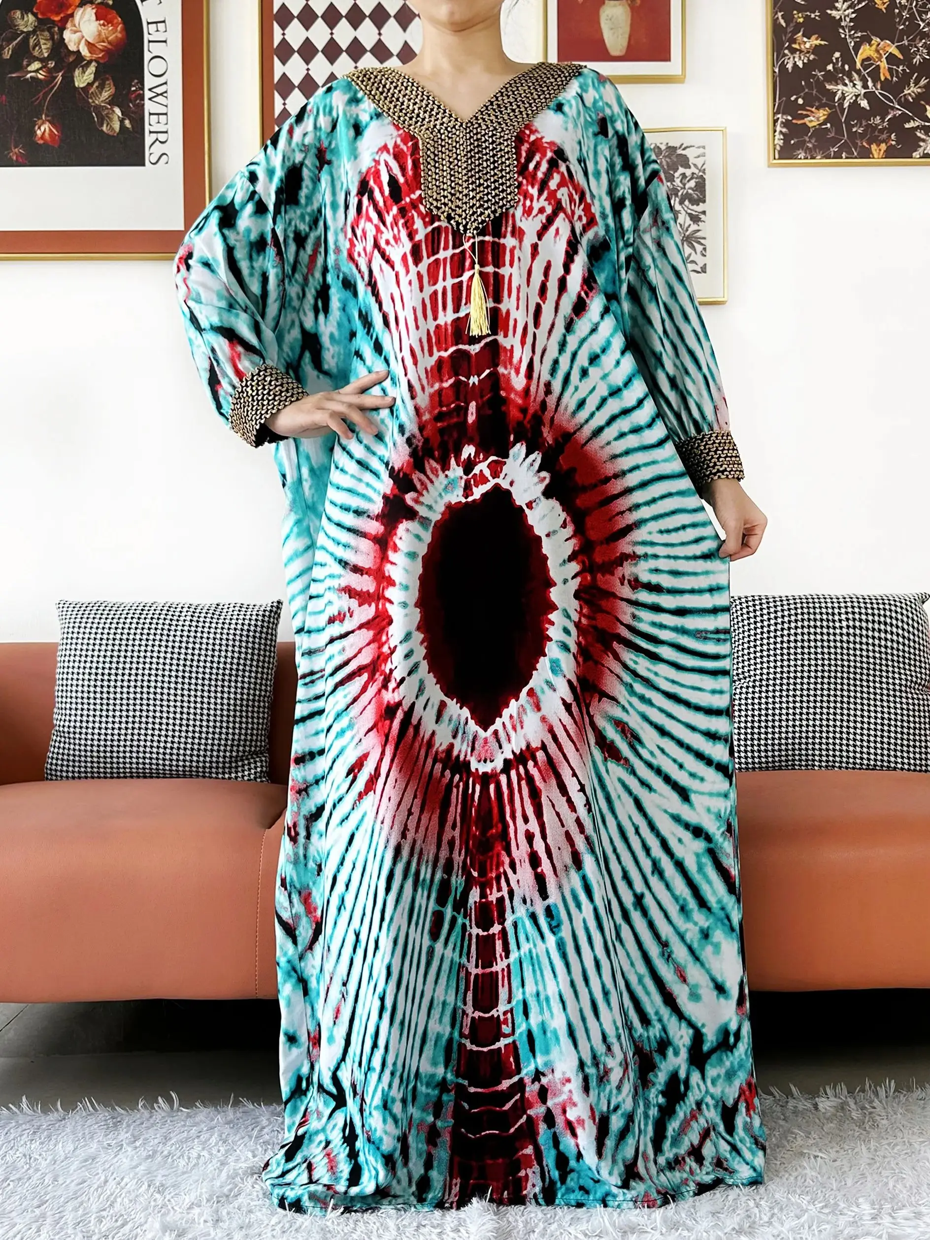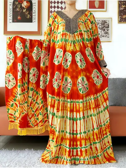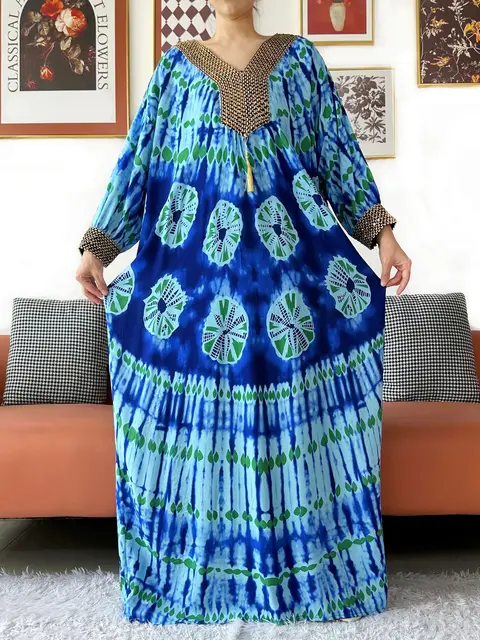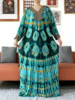Muslim Leaf Pattern Long Sleeve Dress for Women Casual Bohemian Polka Dot Print Holiday Muslim Dress Full Length Abayas Dubai