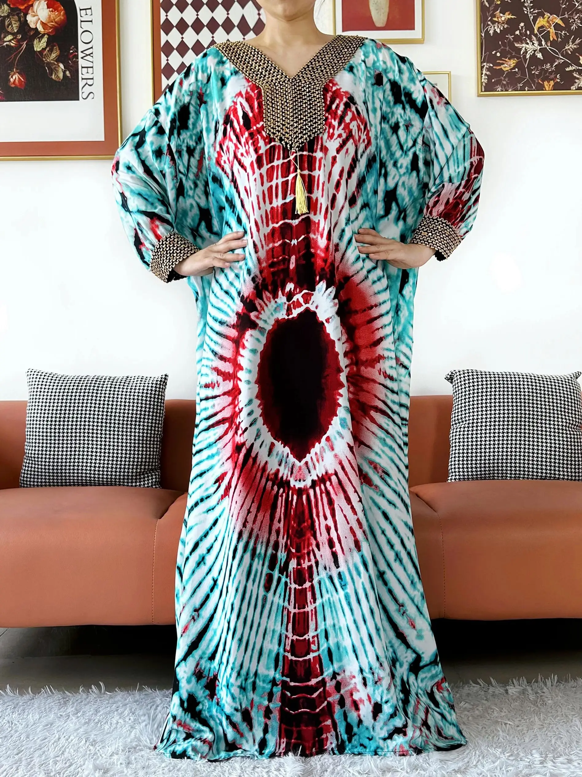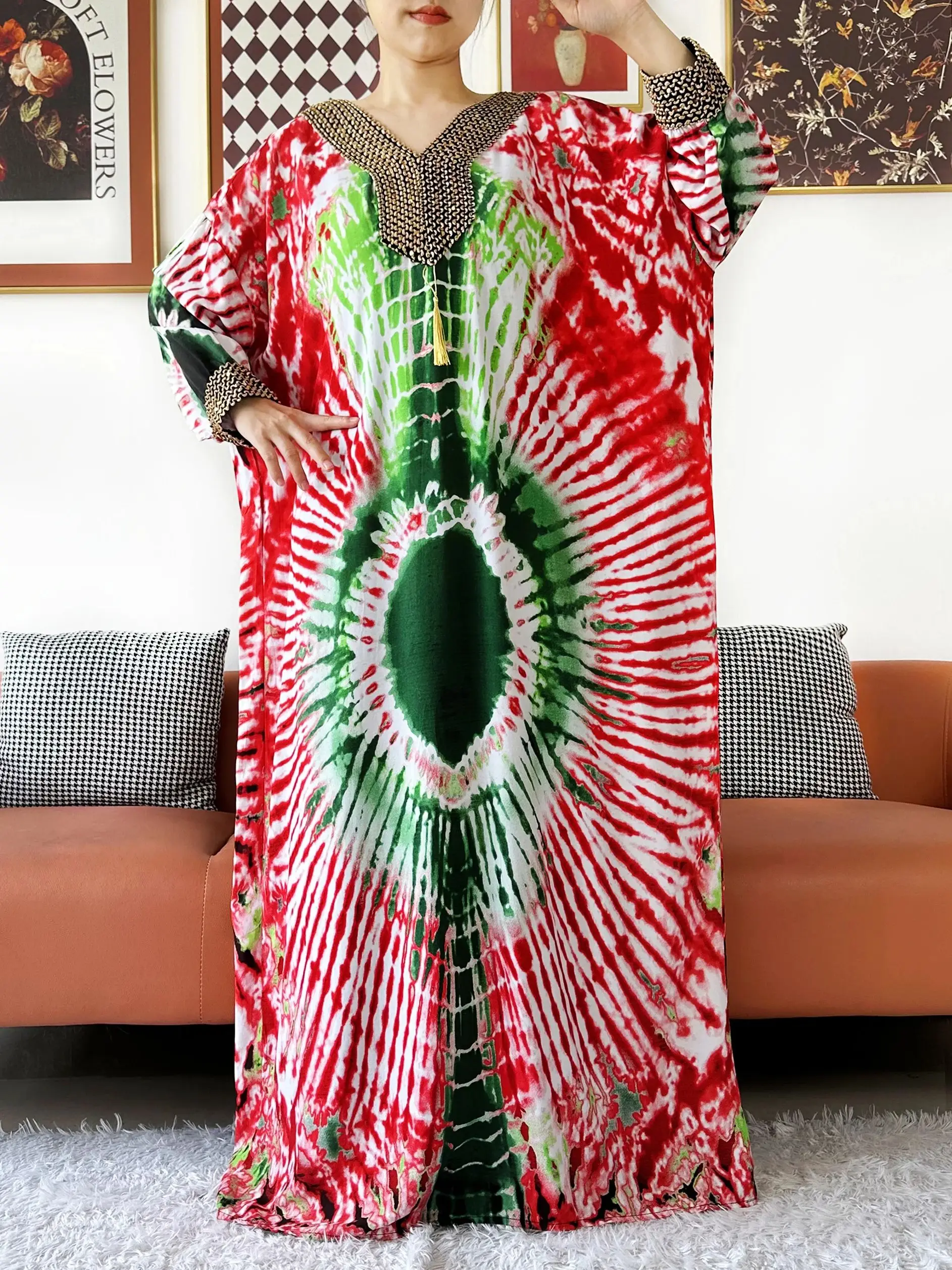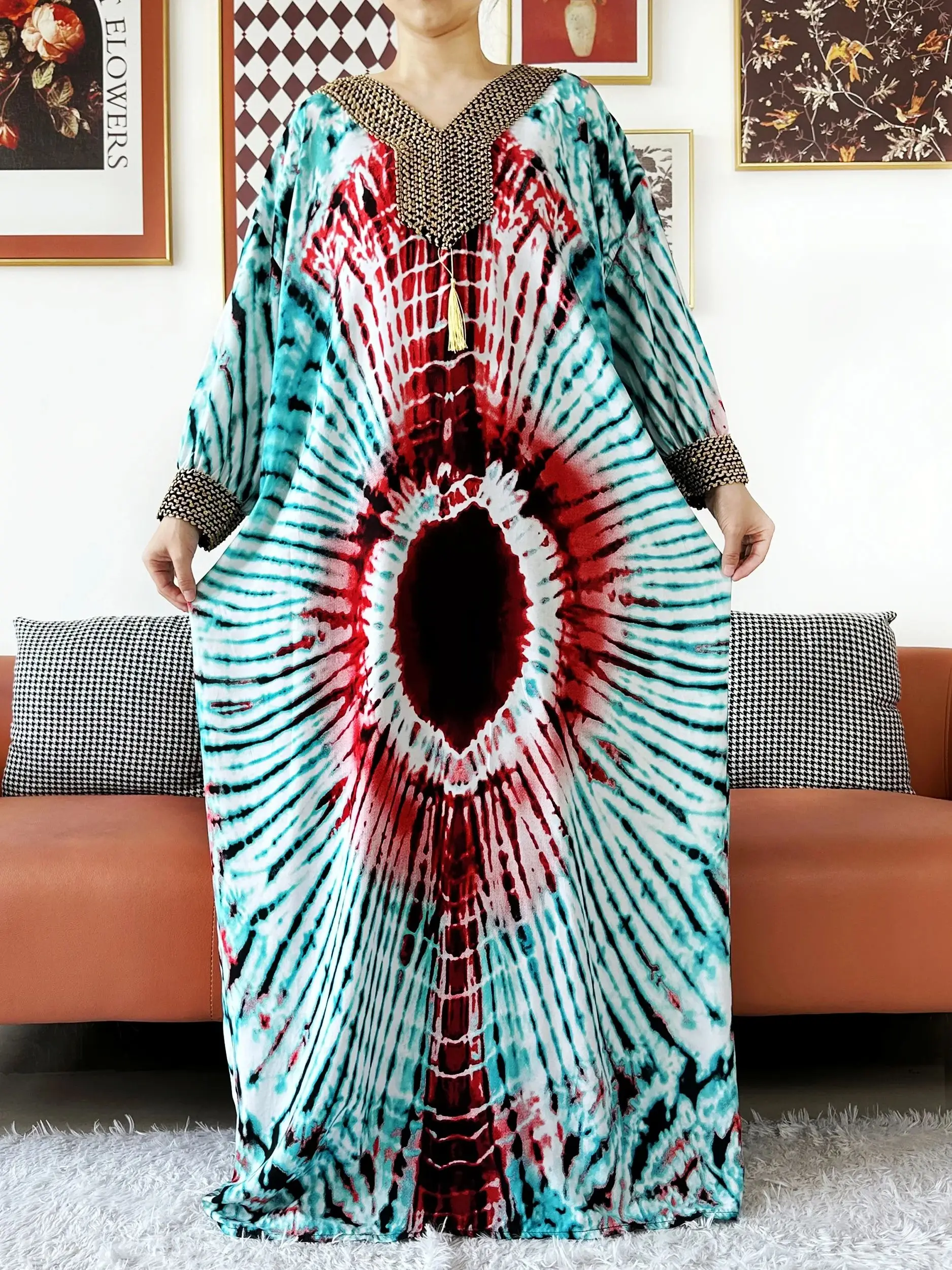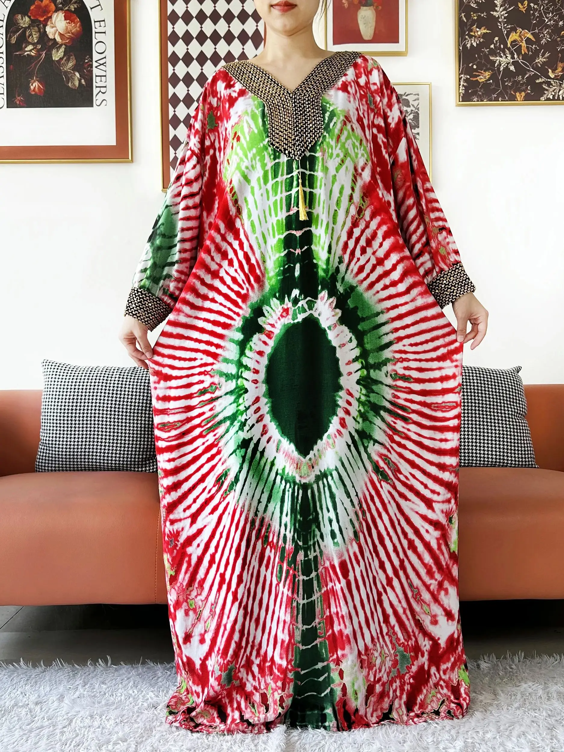 Muslim Leaf Pattern Long Sleeve Dress for Women Casual Bohemian Polka Dot Print Holiday Muslim Dress Full Length Abayas Dubai