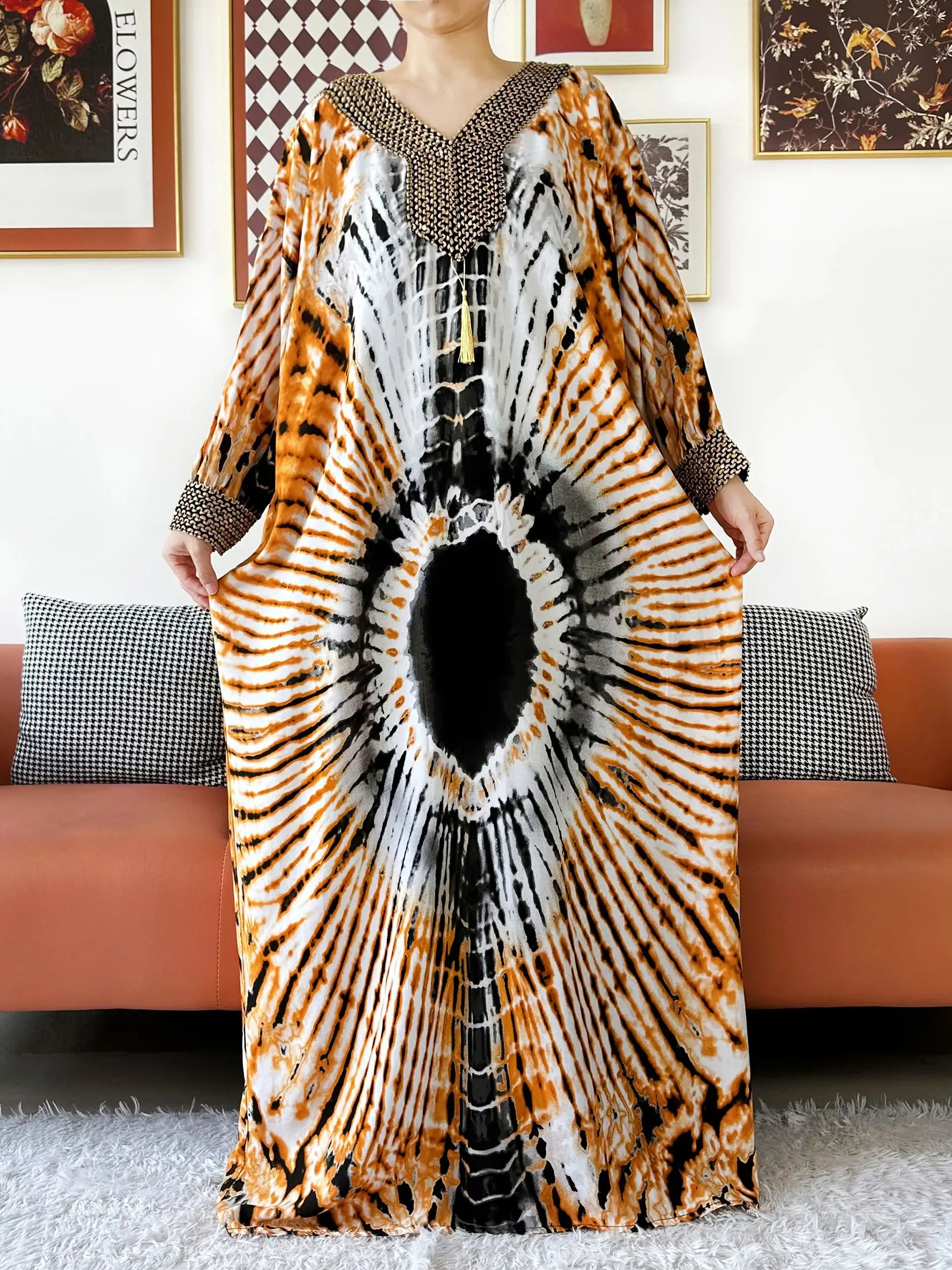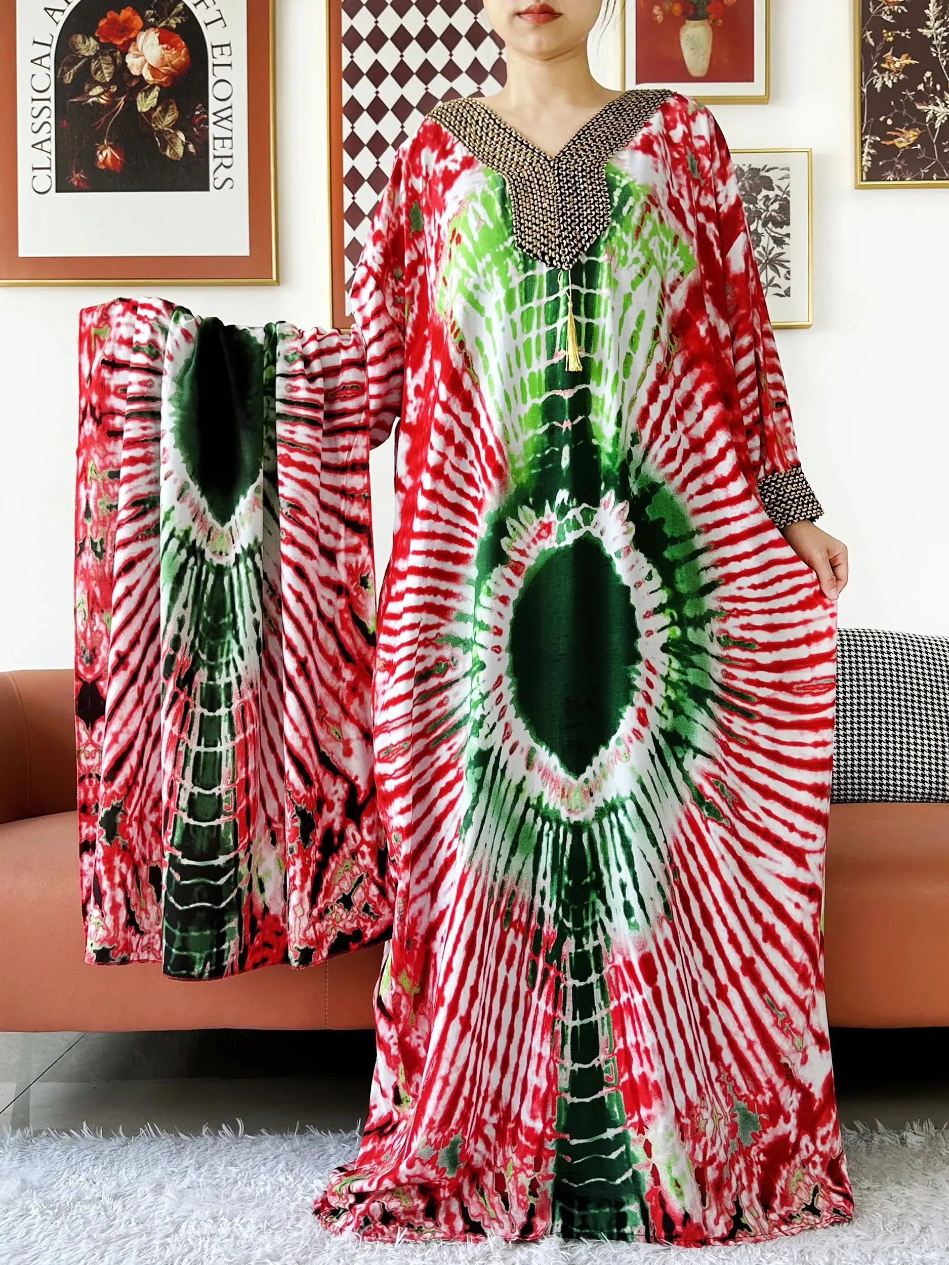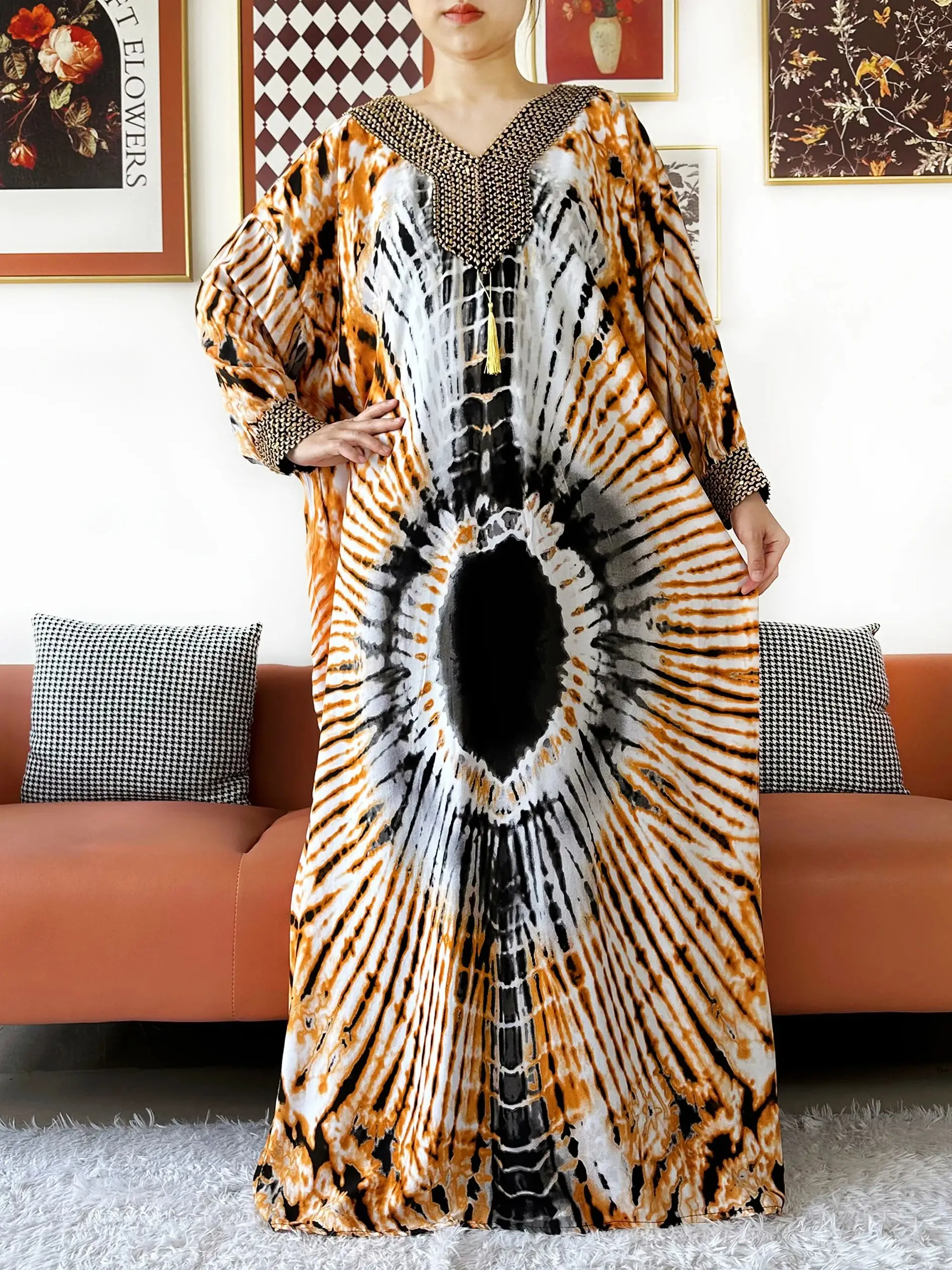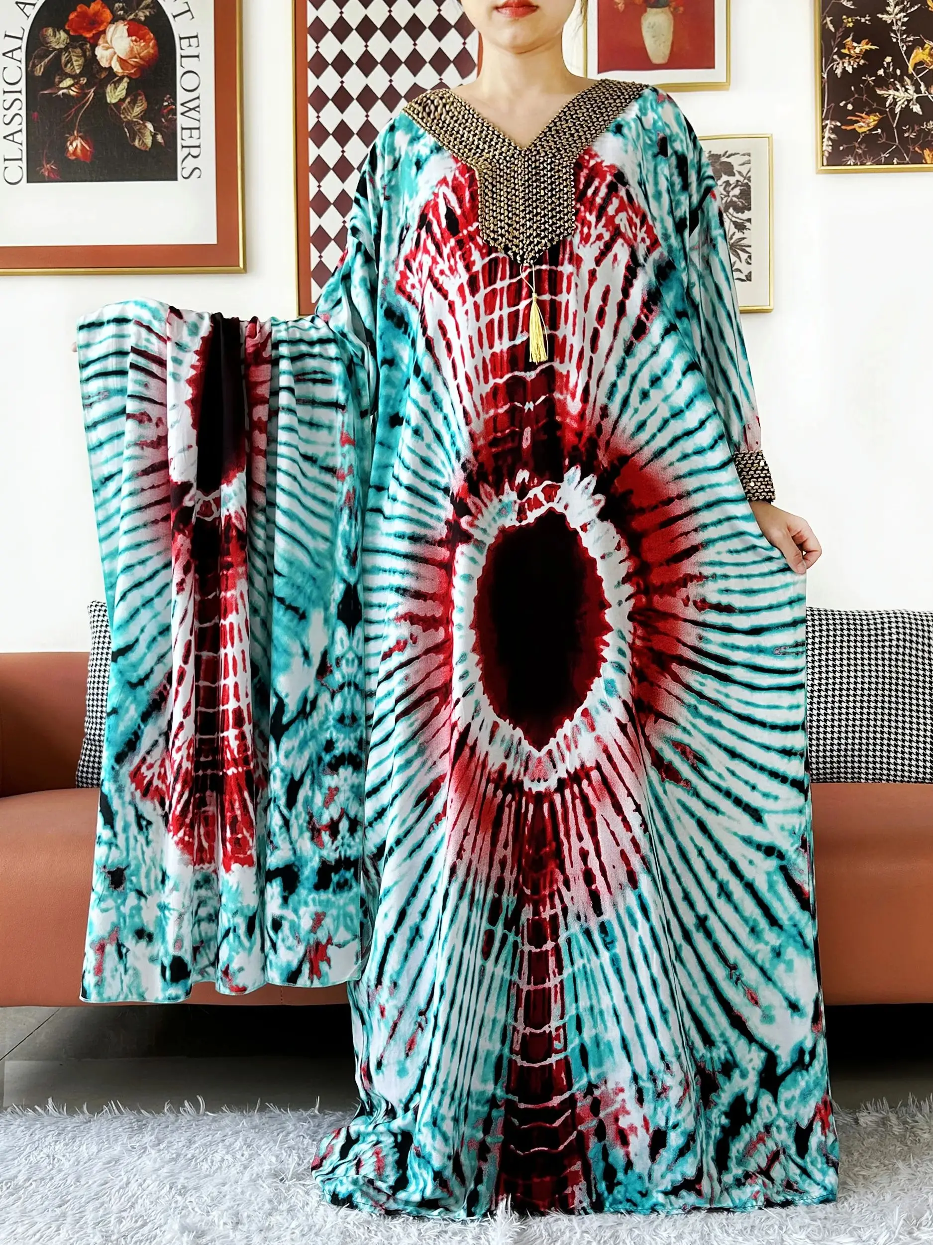 Muslim Leaf Pattern Long Sleeve Dress for Women Casual Bohemian Polka Dot Print Holiday Muslim Dress Full Length Abayas Dubai