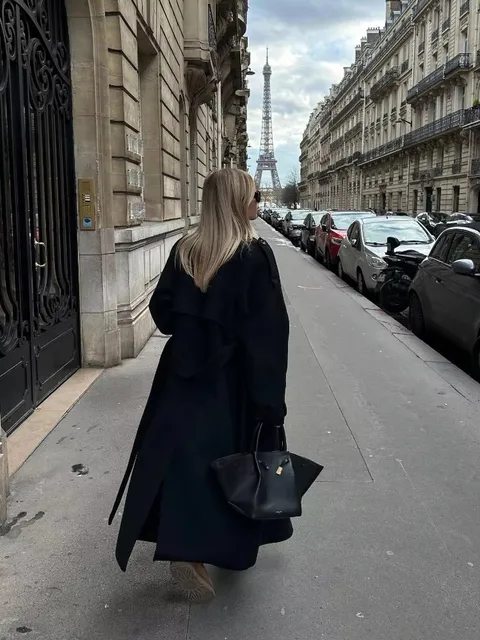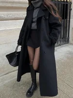 Elegant With Belt Black Long Coat For Women Oversize Woolen Double Button Lapel Overcoat Autumn New Lady
