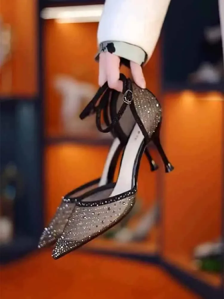 Elegant Women’s Mesh High Heels Shoes 2024 Summer New Style Ribbons Net Face Fine Heel One Line