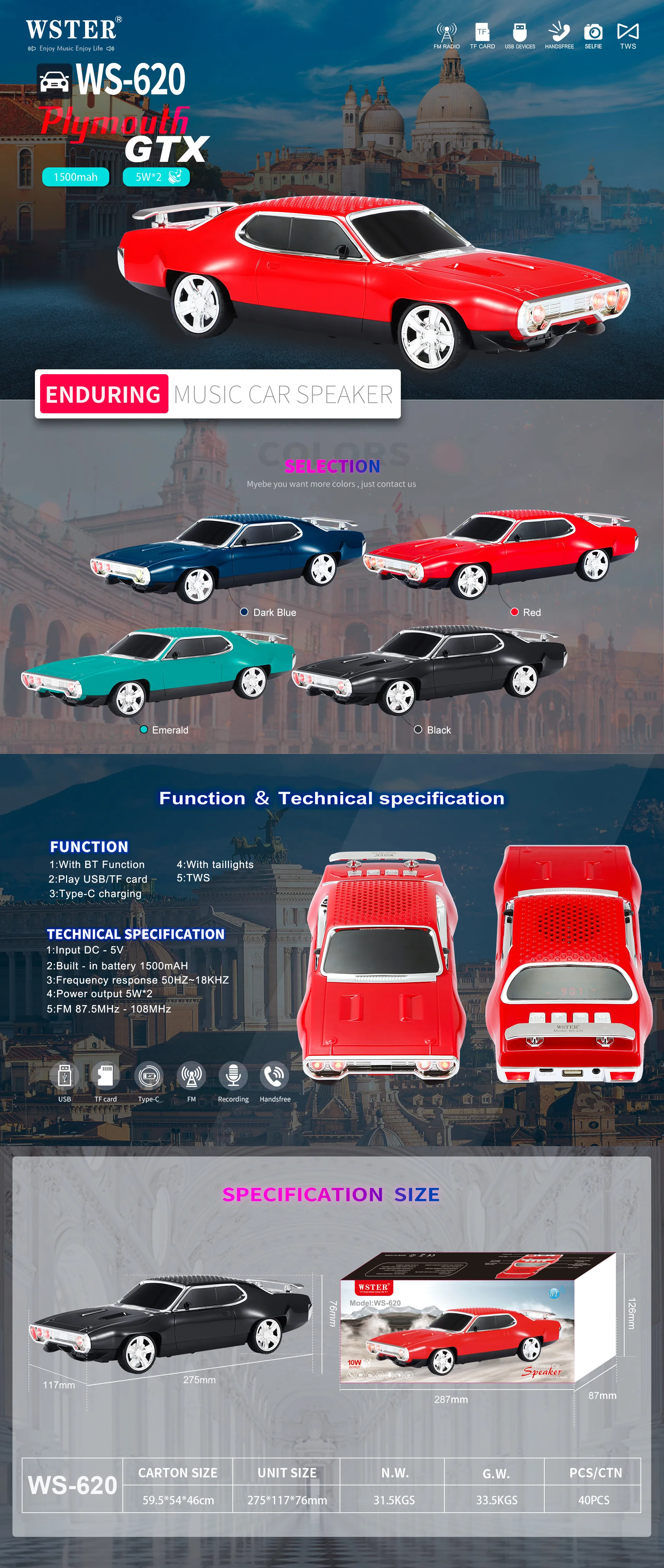 EONKO WS-620 Plymouth GTX Classical Car Shaped Wireless Bluetooth Speaker with TF USB FM AUX TWS Selfie Type C LED Screen
